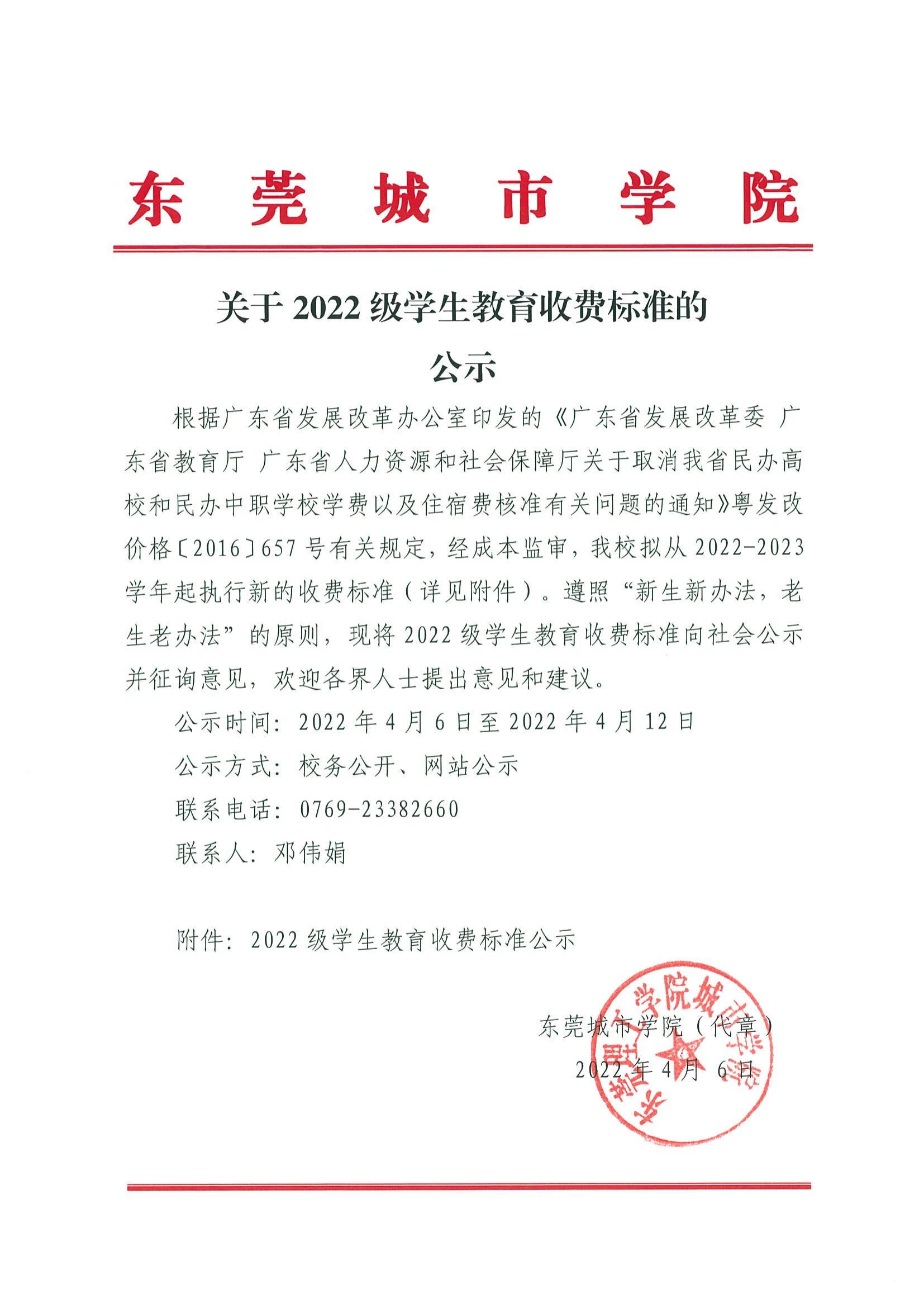 关于2022级学生教育收费标准的公示