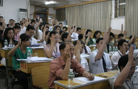5月20日,各代表团在听取了院长安少华教授所作的学院工作报告、章德胜同志所作的工会工作报告、黄甜源所作的工会财务工作报告以及认真阅读《倡议书》后,纷纷展开了激烈的讨论。 第一代表团在团长夏勇,副团长黄研晖的带领下