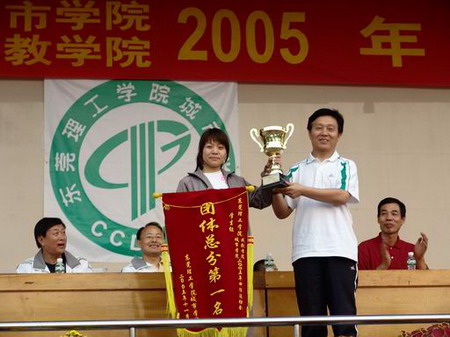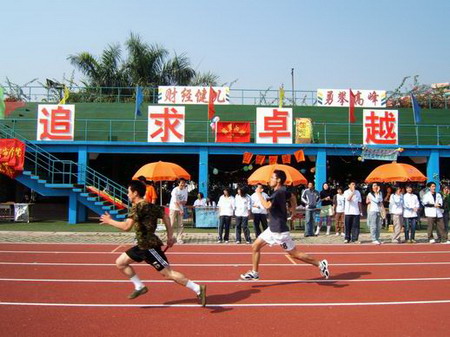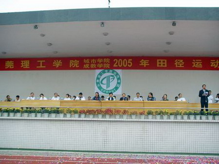 11月25日,东莞理工学院城市学院、成教学院在城市学院田径场隆重举行2005年田径运动会。 煦日当空,秋风送爽。彩旗、气球、红色标语牌把运动场装扮得庄重热烈。新铺设的彩色塑胶跑道在阳光映照下,显得生机勃勃。运动场内外,人潮