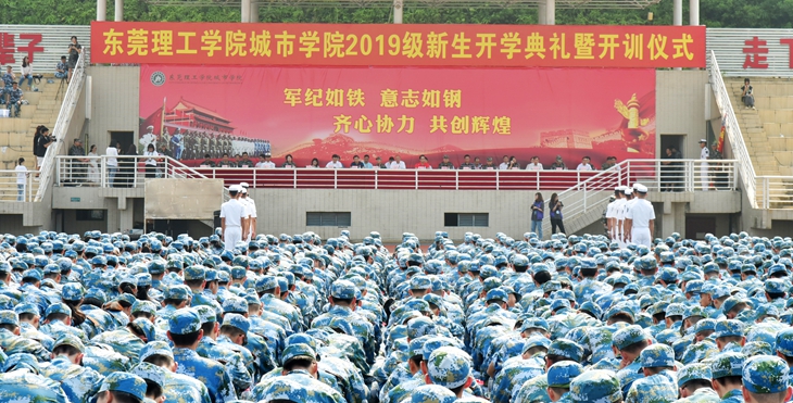 参加活动的领导和嘉宾有:军训团长、承训海军某部队聂峰中校,东莞理工学院党委副书记、城市学院董事会董事吕琦元,寮步镇副镇长曾明山、寮步镇宣传教育文体局副局长陈国良,广东鸿发投资集团有限公司副总裁、东莞理工学院城市学院董事黎建烨,城市学院董事长代表、广东鸿发教育文化集团有限公司总经理陈超群。全体校领导和有关部门负责人、城市学院学生会主席,以及2019级全体新生参加了开学典礼暨军训开训仪式。典礼由副校长黄兢主持。