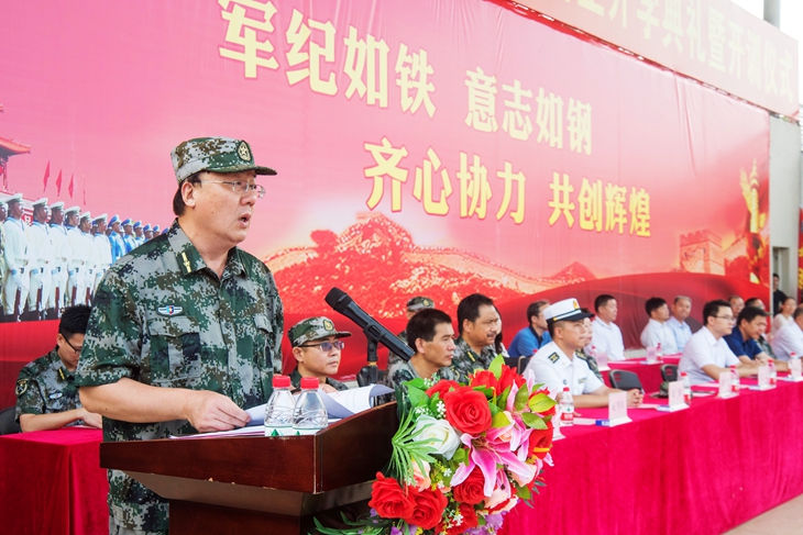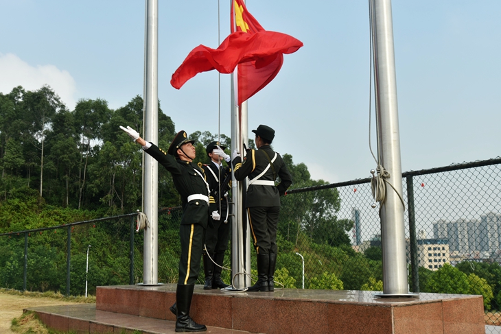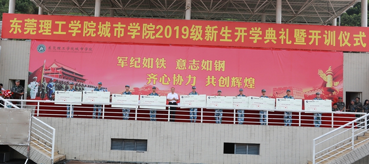 王卫平校长向军训团团长聂峰海军中校授“东莞理工学院城市学院军训团”团旗,由此拉开了为期半个月的军训大幕。