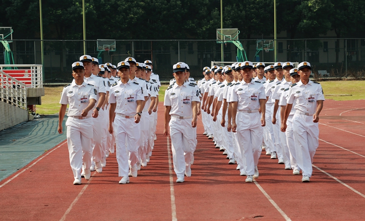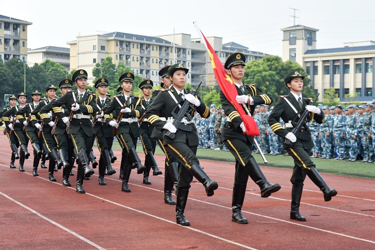 在军训开训仪式上,全体军训团教官在热烈的掌声中入场。