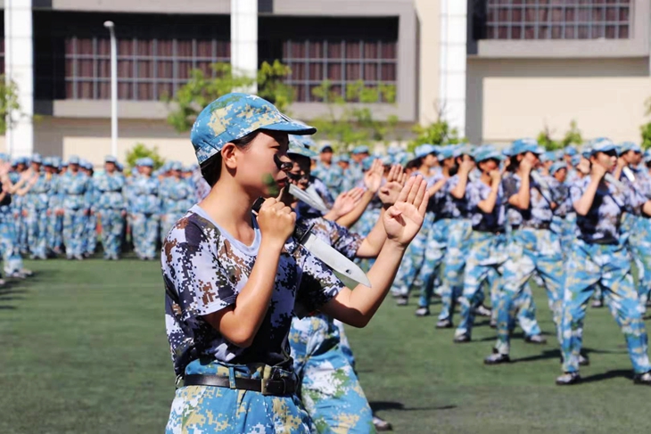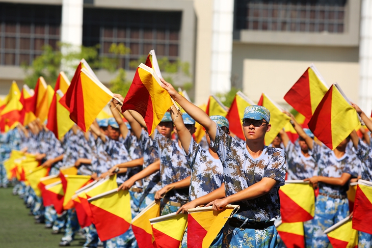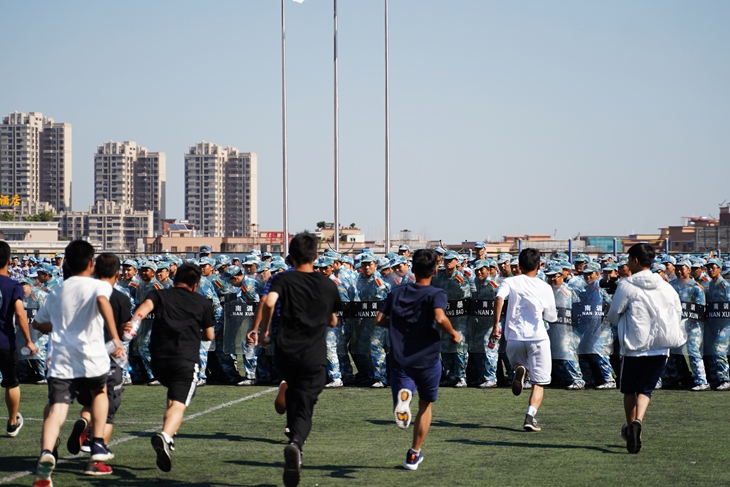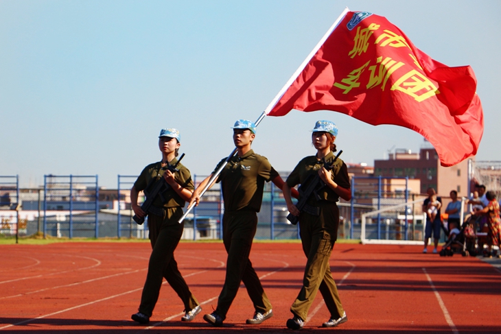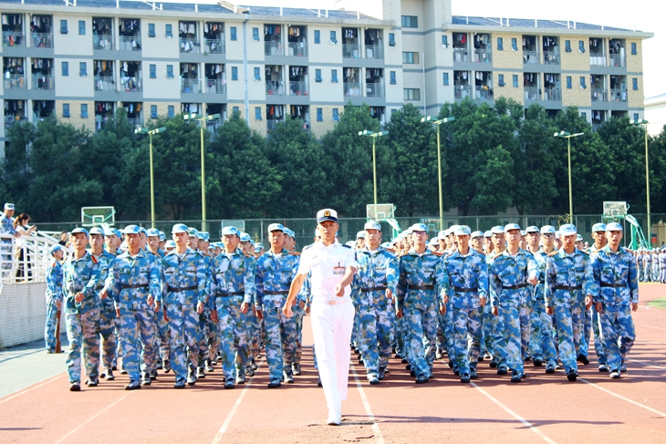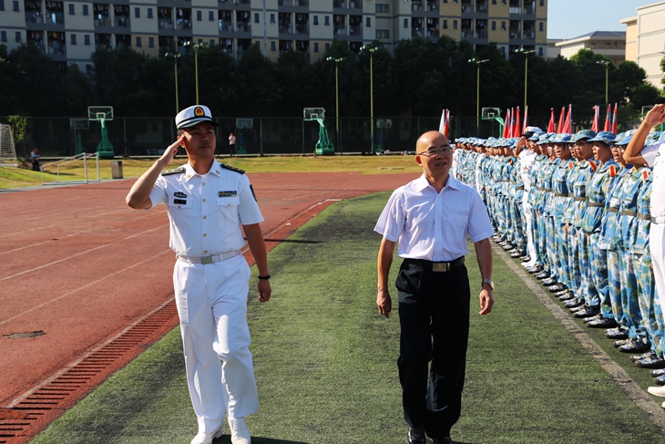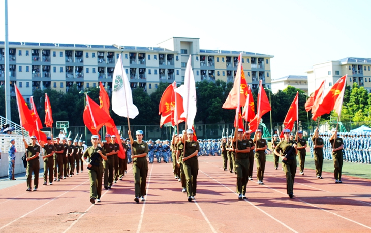 在运动场上,军乐激昂,王卫平校长在军训团长聂峰的陪同下检阅了受训新生队伍。