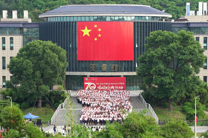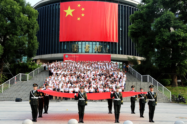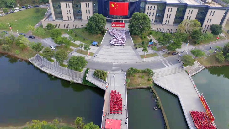 金秋时节,阳光灿烂,风清气爽。校园内,处处挂满了鲜艳的五星红旗,洋溢着浓浓的庆祝新中国70华诞的喜庆氛围。一幅巨型的五星红旗悬挂在图书馆正门的蓝色玻璃幕墙上,成为学校的网红圣地。