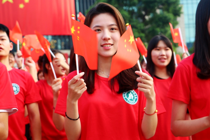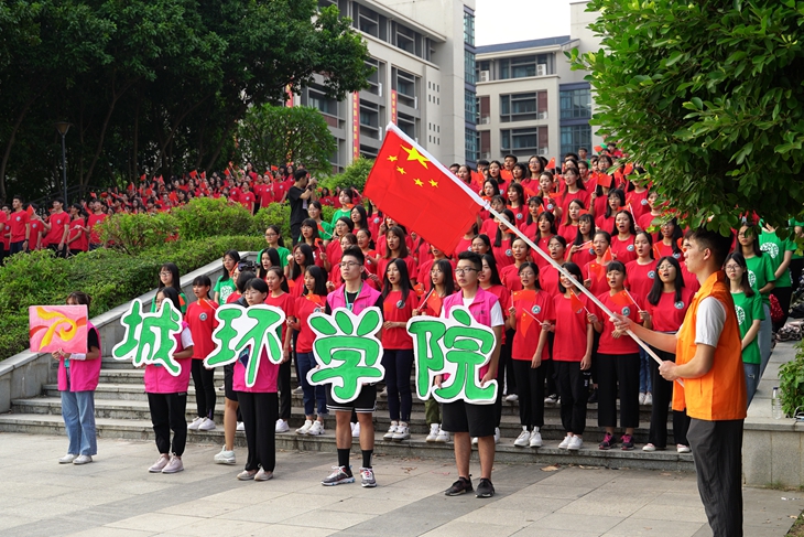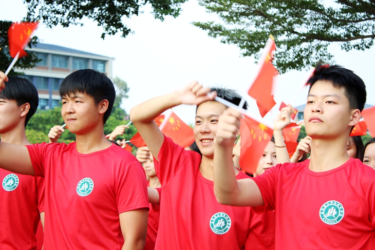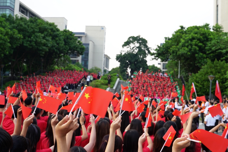 下午16时,从图书馆小广场到映月湖桥上,延伸至秋枫广场,国旗飘扬,二级学院几千名学生组成的10个方阵身着红色衣衫,整齐排列,连成了一片红色的海洋。