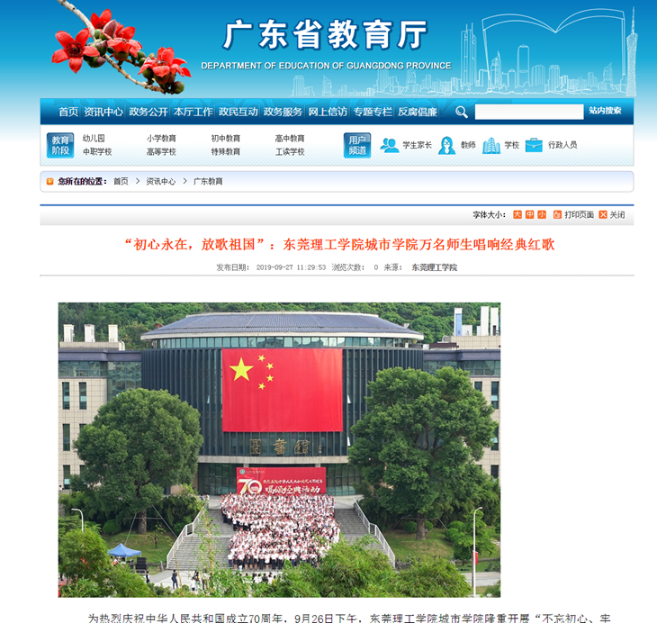 9月27日,中国网以《东莞理工学院城市学院创新举办庆祝新中国成立70周年唱颂经典活动》为题,进行了长篇报道。广东省教育厅网站在“广东教育”栏目以《“初心永在,放歌祖国”:东莞理工学院城市学院万名师生唱响经典红歌》为题,对活动进行了大篇幅的报道。