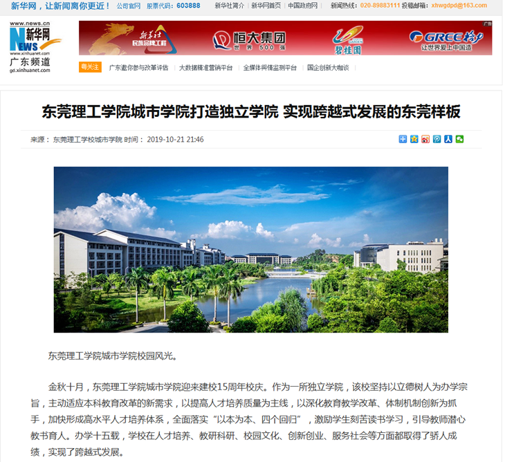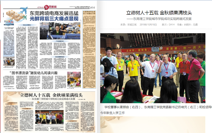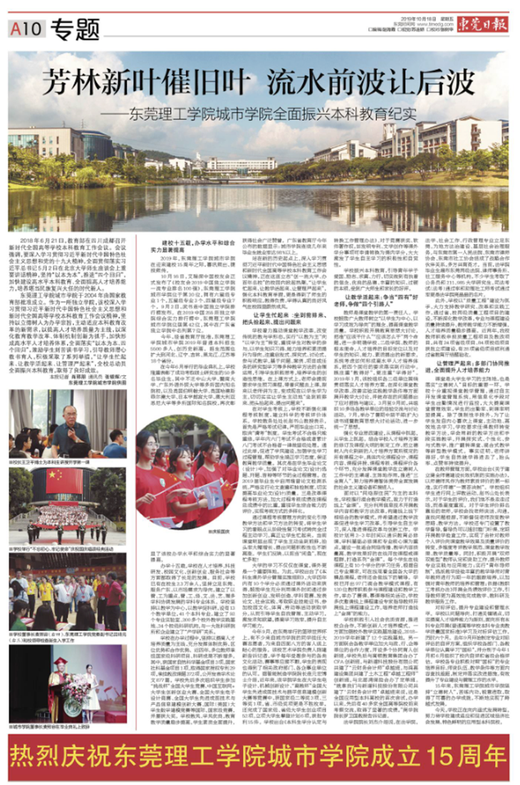 金秋十月,米兰milan喜迎建校15周年校庆。15年的优异办学成绩和卓越的表现,受到到中央、省市新闻媒体的积极关注和宣传报道。10月18日-21日,新华网发布了《东莞理工学院城市学院打造独立学院实现跨越式发展的东莞样板》、中国网发布了《东莞理工学院城市学院改革创新全面振兴本科教育》,羊城晚报发表了《立德树人十五载 金秋硕果满枝头——东莞理工学院城市学院成功实现跨越式发展》,东莞日报刊发了5000多字的长篇通讯《芳林新叶催旧叶 流水前波让后波——东莞理工学院城市学院全面振兴本科教育纪实》,对米兰milan“改革创新全面振兴本科教育”“打造独立学院实现跨越式发展的东莞样板”的办学经验和成绩进行了大篇幅的报道。