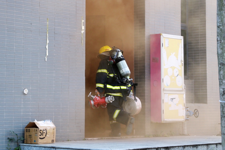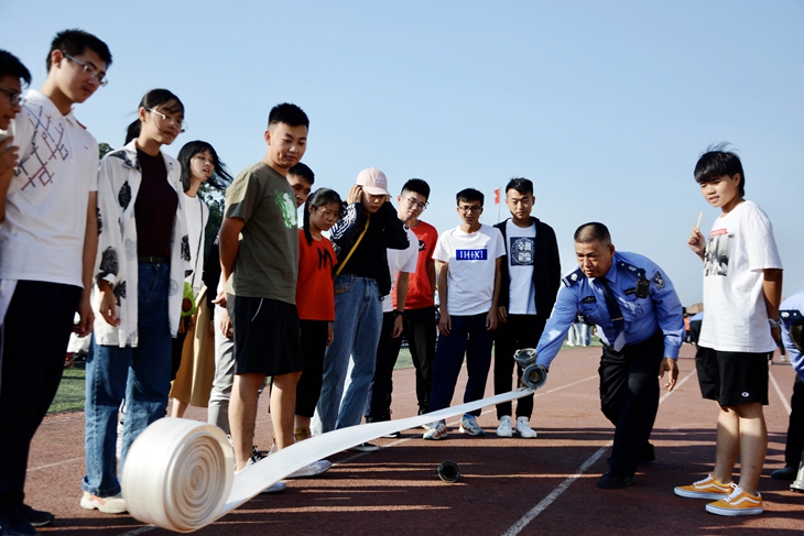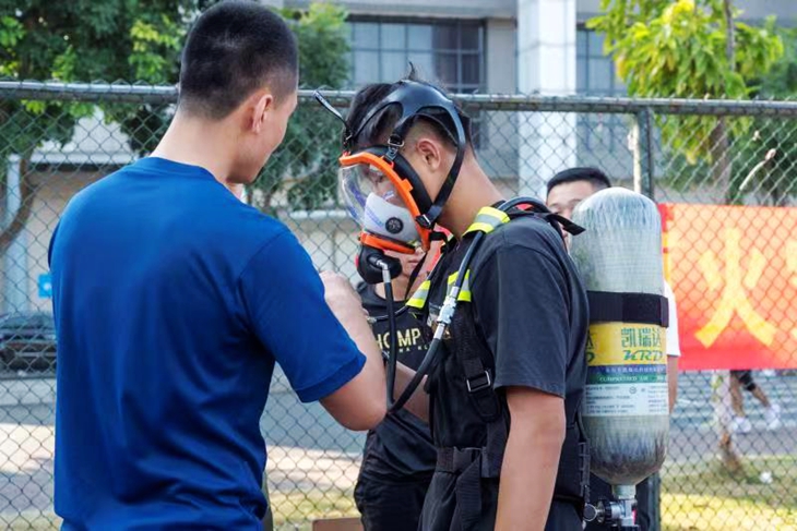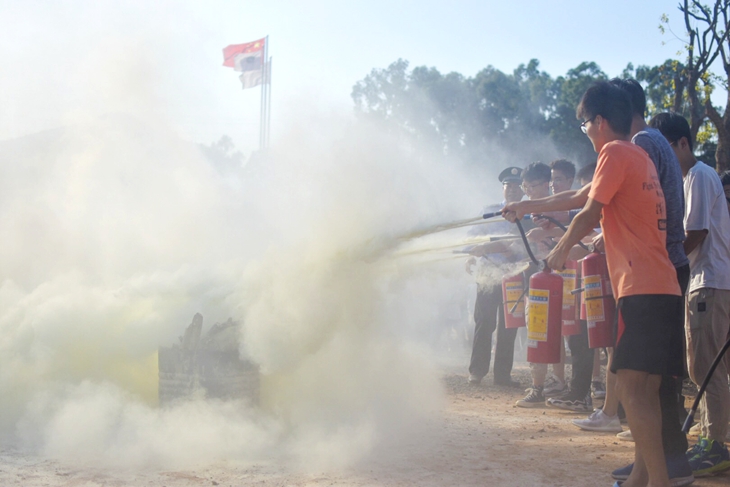 此次消防演练分为如何使用灭火设备、被困人员解救、消防栓灭火器灭火、消防设备参观与体验等五部分内容。寮步消防中队向同学展示灭火器和消防水带等日常灭火技能,现场对消防器材功能及使用常识进行详细讲解示范。