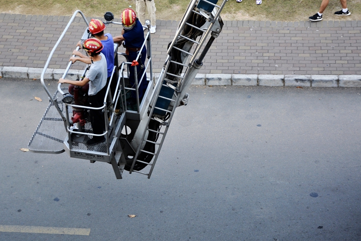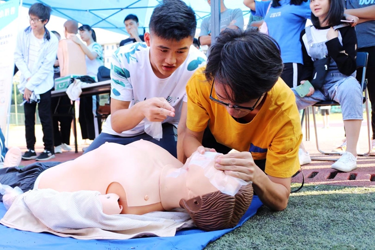 消防演练上,同学们在多个场合进行了模拟火灾现场逃生体验。红十字会进行了现场心肺复苏教学与指导。