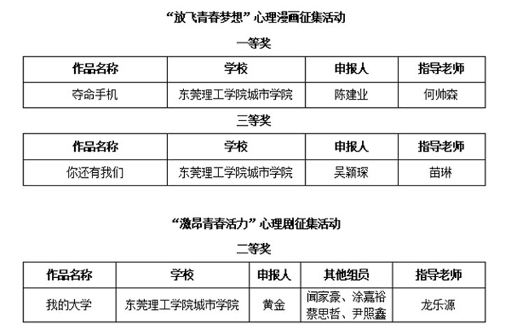 据悉,为加强高校心理健康教育工作,广东省教育厅于今年5月至9月在全省高校组织开展了“放飞青春梦想”心理漫画征集活动、“激扬青春活力”心理剧征集活动、“追逐青春理想”心理健康主题演讲征集活动等5个心理健康教育活动。