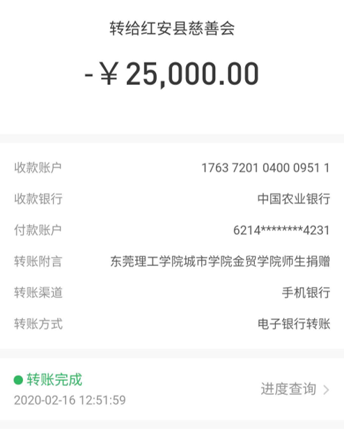(图为金贸学院捐赠给红安县慈善会转账截图)