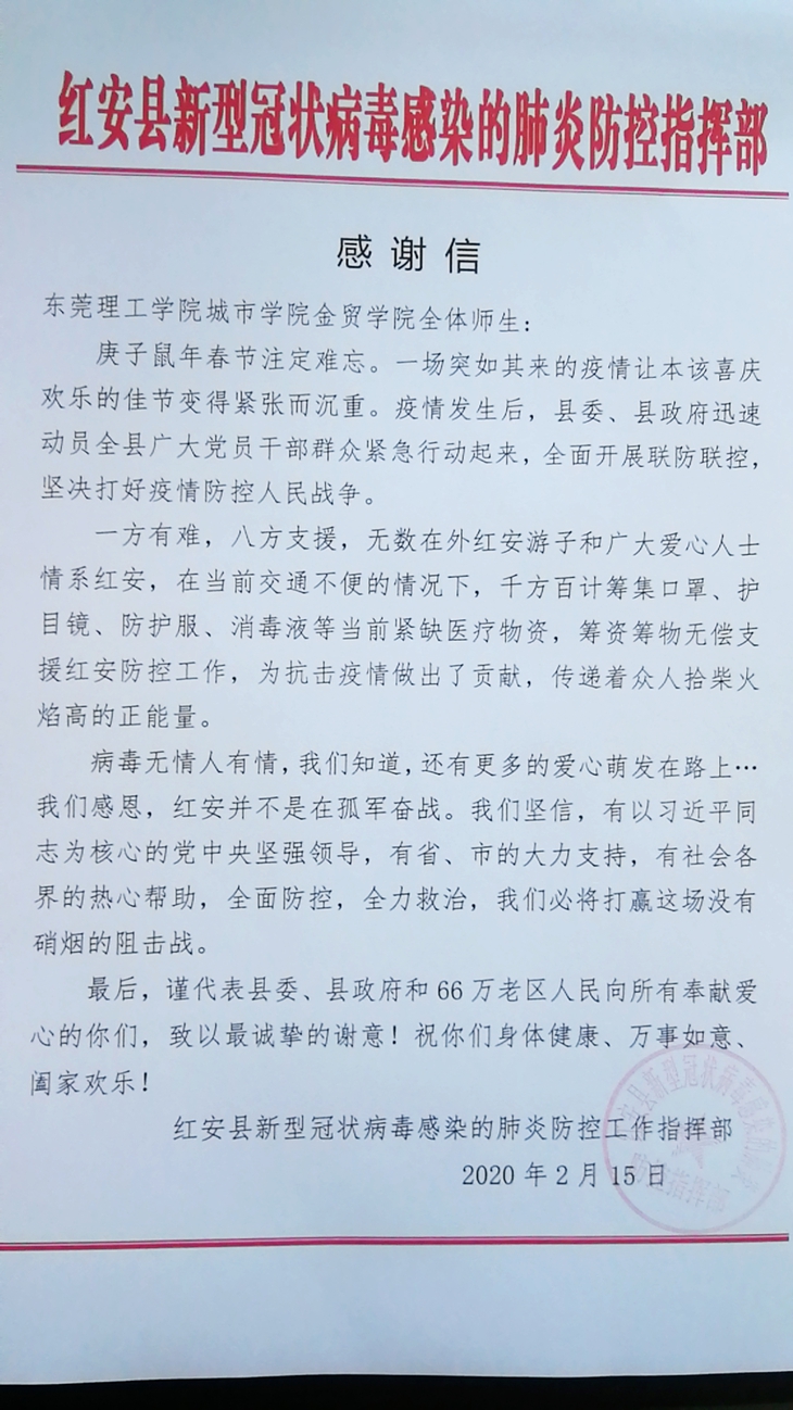 与此同时,万文双、郭忠林、刘鹤鹤、侯瑞瑞、米霏、占晶晶、朱佳丽等多位老师立即通过多种方式、多种途径,积极对接疫区一线,主动了解重点医用防护物资需求,拓展物资采购渠道,经过不懈努力,从美国为红安医院采购了第一批医用防护物资——200个N95口罩,并立即寄往黄冈市红安县人民医院。随后,为缓解红安物资紧缺状况,将部分款项捐赠给红安县慈善会采购物资。剩余款项将继续联系渠道帮忙采购紧缺物资。为此,红安县特意发来了感谢信。