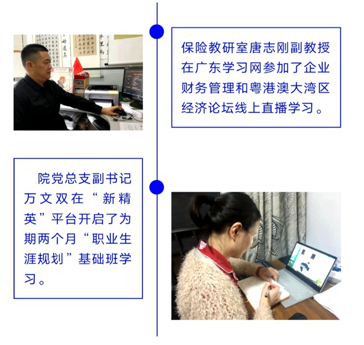 在疫情防控期间,金融与贸易学院根据学校的部署安排,全体教师积极探索,认真备课,保证全院线上教学活动顺利开展。与此同时,全院教师在院领导的带领下,由教研室主任带动老师在课余时间积极参加各类线上学习培训,努力提升自己,营造了浓郁的“停课不停教,停课不停学”学习氛围,在探索创建学习型组织的道路上更上一层楼。