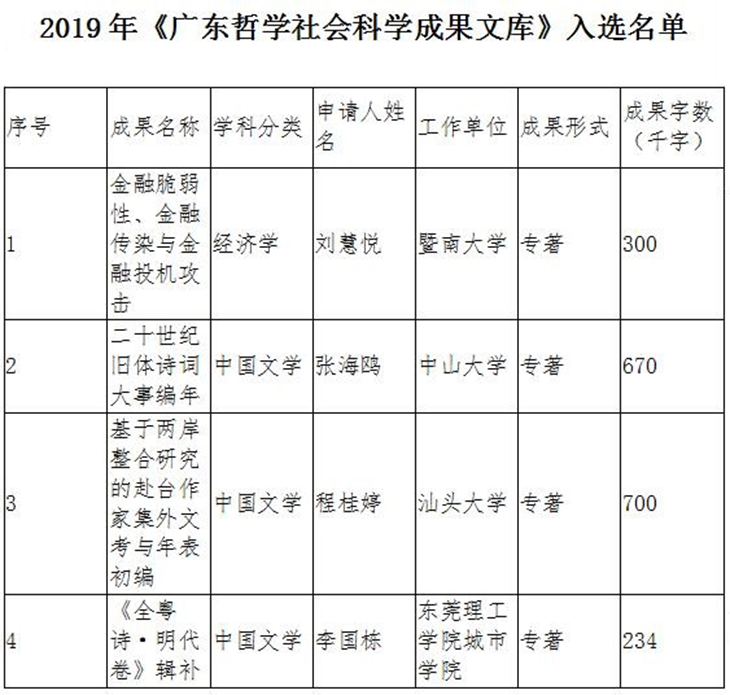 近日,广东省哲学社会科学规划领导小组办公室公布了2019年《广东哲学社会科学成果文库》入选名单,米兰milan文学与传媒学院李国栋老师的研究成果《<全粤诗·明代卷>辑补》成功入选,这也是米兰milan教师成果首次入选《广东哲学社会科学成果文库》。