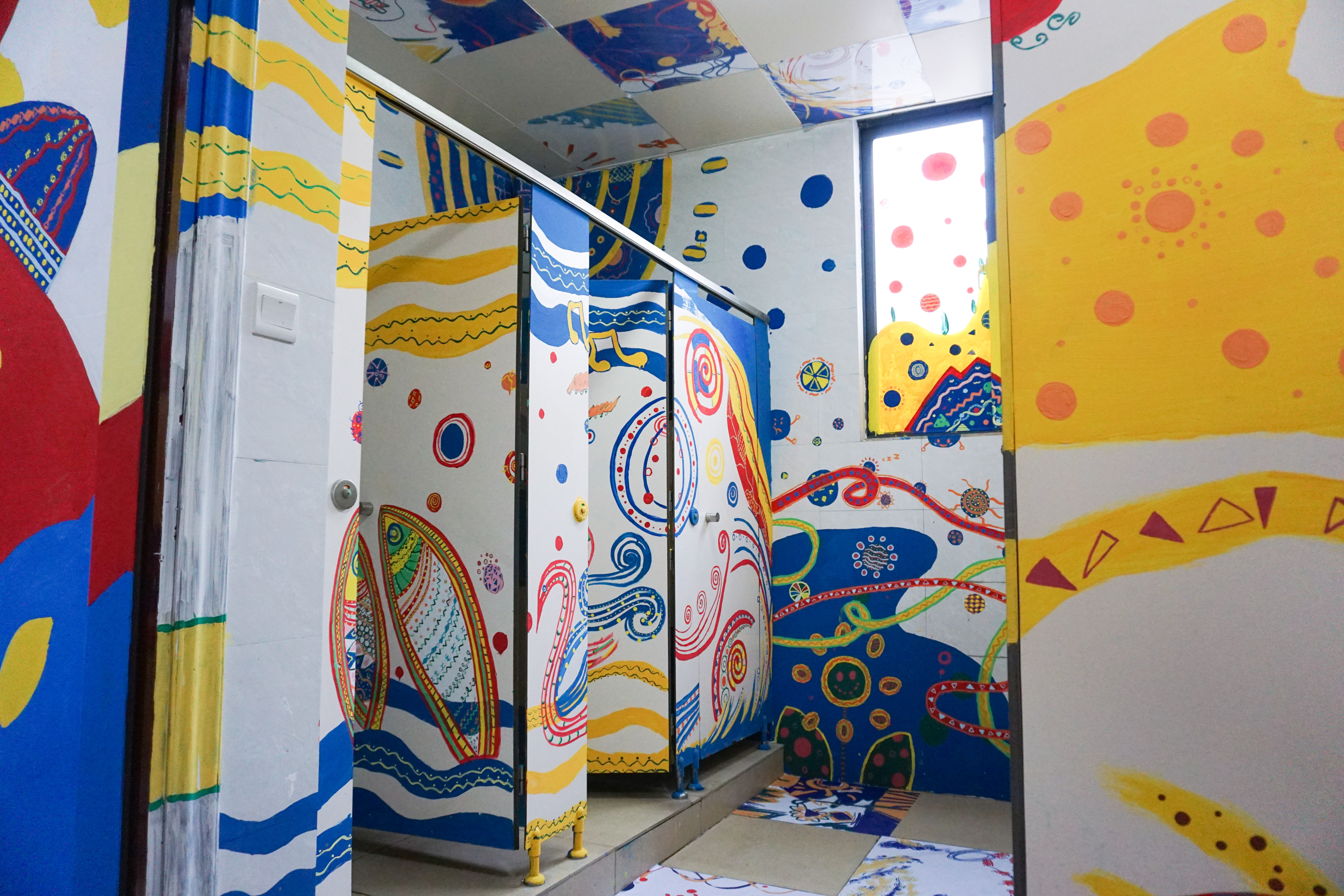 本次装置艺术以米兰milan卫生间为设计基础,创意设计学院副院长林右正教授带领2019级视觉传达设计专业3班同学,分为4个主题:《爱丽丝梦游仙境》(一)(二)、《宇宙星空》以及《撞色》,运用色彩的碰撞,与点线面的结合,绘制出4种不同风格的厕所装置设计,内容丰富有趣、题材创新多样,从色彩、表现内容、情节等,透过想象,以手绘及拼贴等多元应用方式表现,形成独具特色的卫生间装置艺术作品。