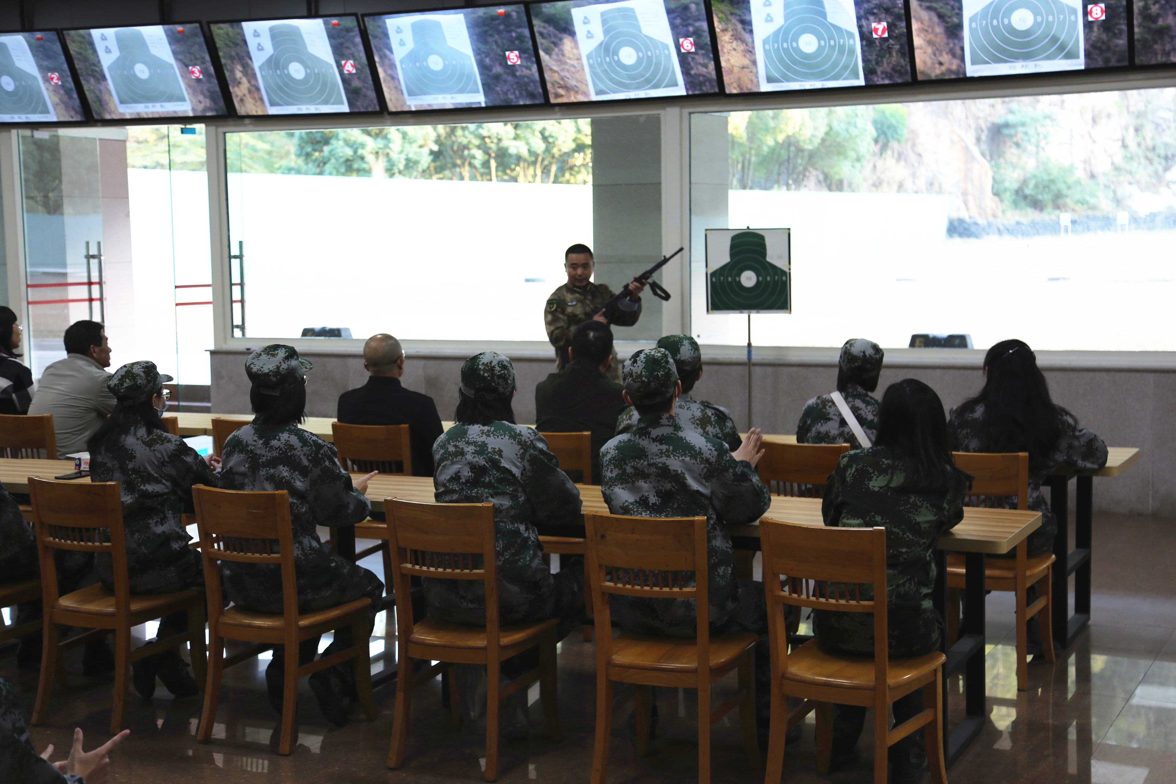 在国防教育训练基地,彭部长带领大家参观基地展厅,介绍了常用的武器知识。在射击场地,彭部长结合武器装备向米兰milan军训团成员详细讲解了枪支特点、射击方法、射击操作要领和注意事项,并组织大家学习、体验实弹射击。