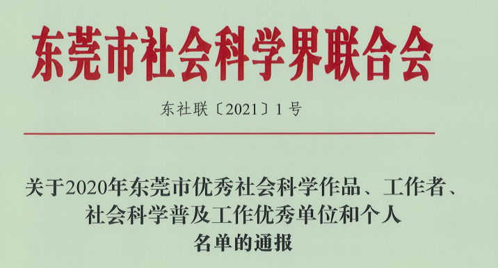 据了解,东莞市优秀社会科学作品由东莞市社会科学联合会组织,每年评审一次。评奖着眼于进一步繁荣发展哲学社会科学,推动东莞市哲学社会科学事业的发展,解决东莞市率先实现现代化进程中出现的理论和实际问题,促进全面深化改革、加快转型发展,为奋力推动“湾区都市、品质东莞”建设迈上新台阶贡献社科力量。