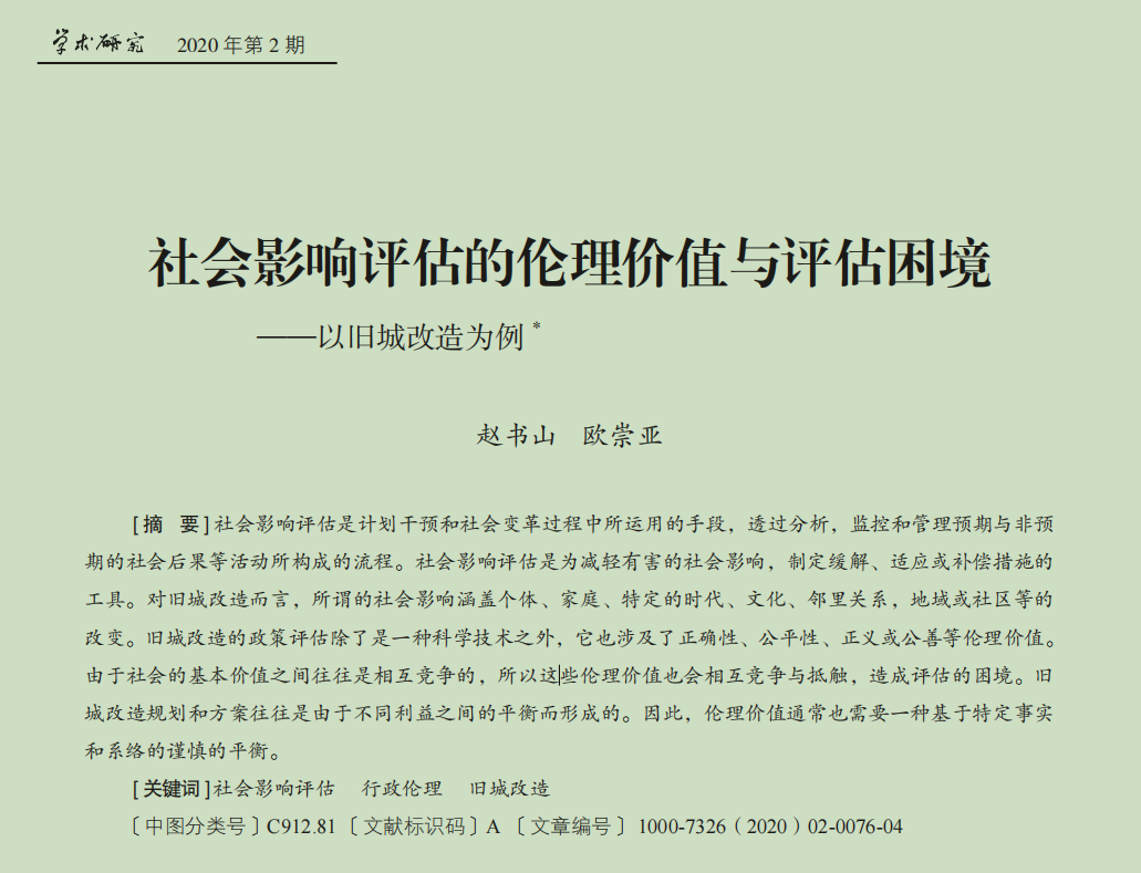 该论文指出社会影响评估是计划干预和社会变革过程中所运用的手段,透过分析,监控和管理预期与非预期的社会后果等活动所构成的流程。社会影响评估是为减轻有害的社会影响,制定缓解、适应或补偿措施的 工具。对旧城改造的社会影响涵盖个体、家庭、特定的时代、文化、邻里关系,地域或社区等的改变,涉及了正确性、公平性、正义或公善等伦理价值。由于社会的基本价值之间往往是相互竞争的,所以这些伦理价值也会相互竞争与抵触,造成评估的困境。旧 城改造规划和方案往往是由于不同利益之间的平衡而形成的。因此,伦理价值通常也需要一种基于特定事实和系络的谨慎的平衡。论文对当前多城市的旧城改造和社会影响有着指导意义。