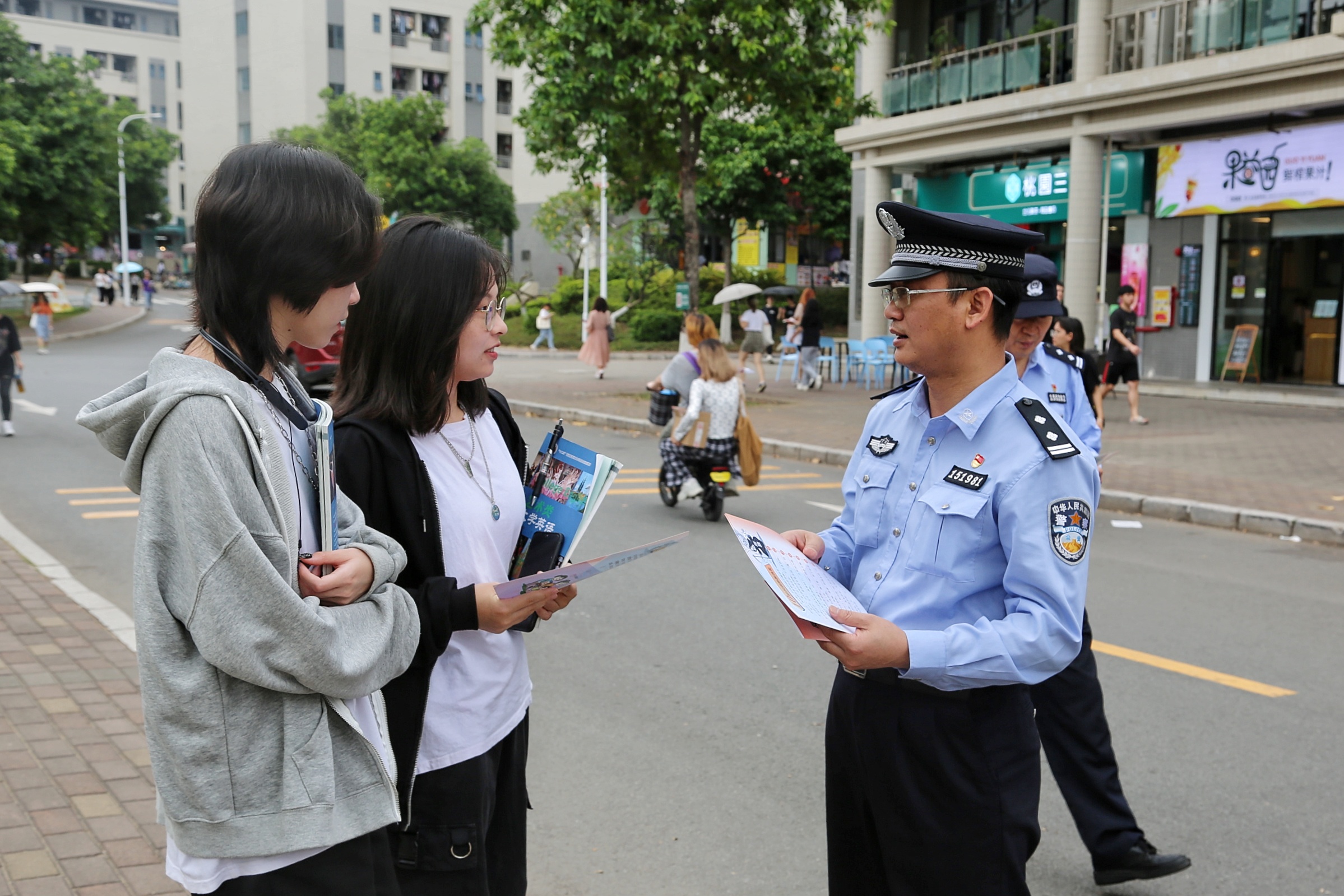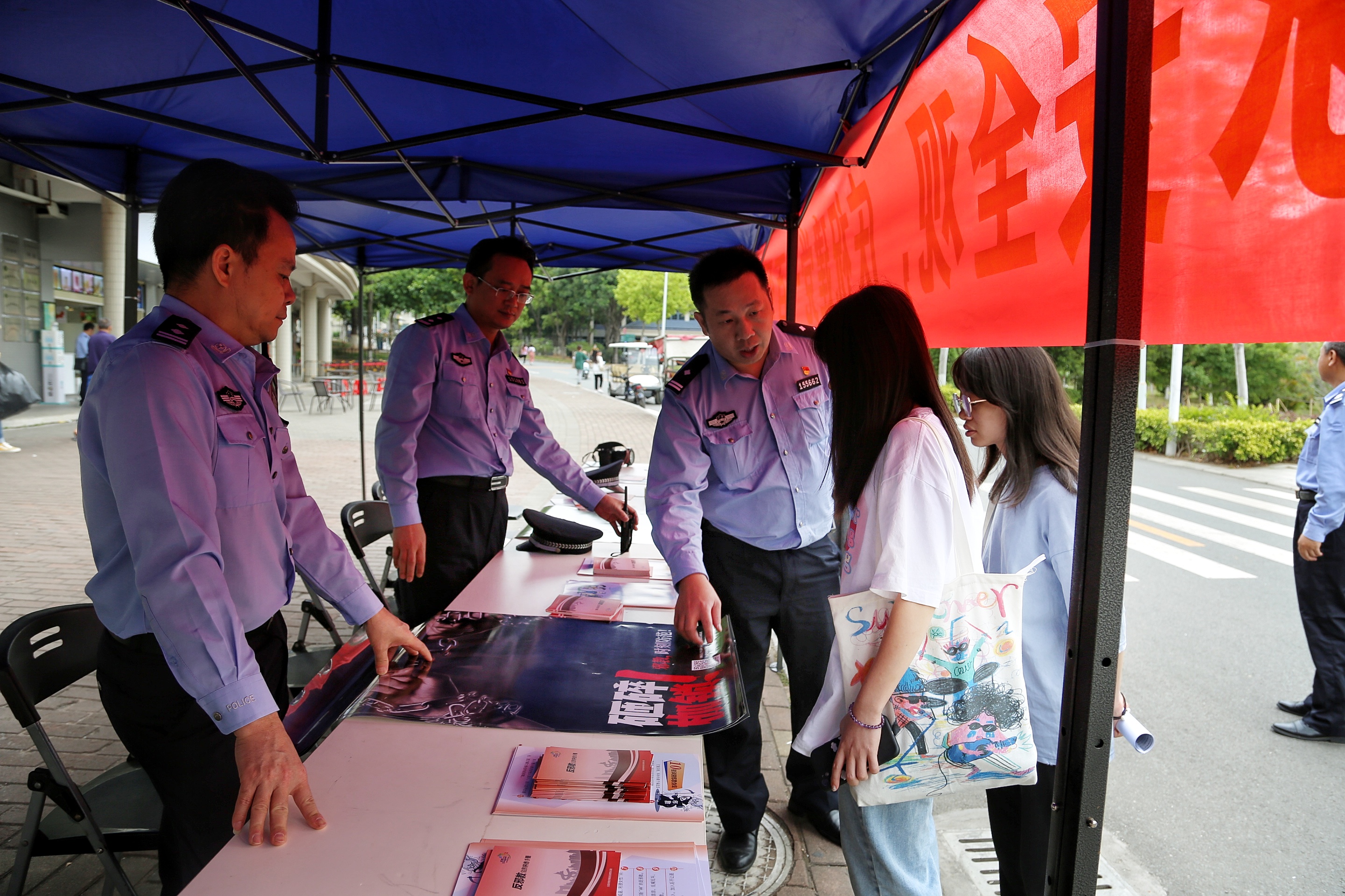 悬挂宣传横幅、张贴宣传海报、发放宣传资料、设立咨询服务台、讲解国家安全教育常识……公安分局警官、党委宣传部工作人员通过多种方式向学生们宣传国家安全方面的知识。“什么是国家安全,全民国家安全教育日的来历、意义……”警官们结合自身工作实际,列举大量工作实例,为学生们深入浅出地讲解了国家安全相关的知识,并带领大家了解国家安全法、反恐怖主义法等法律法规。