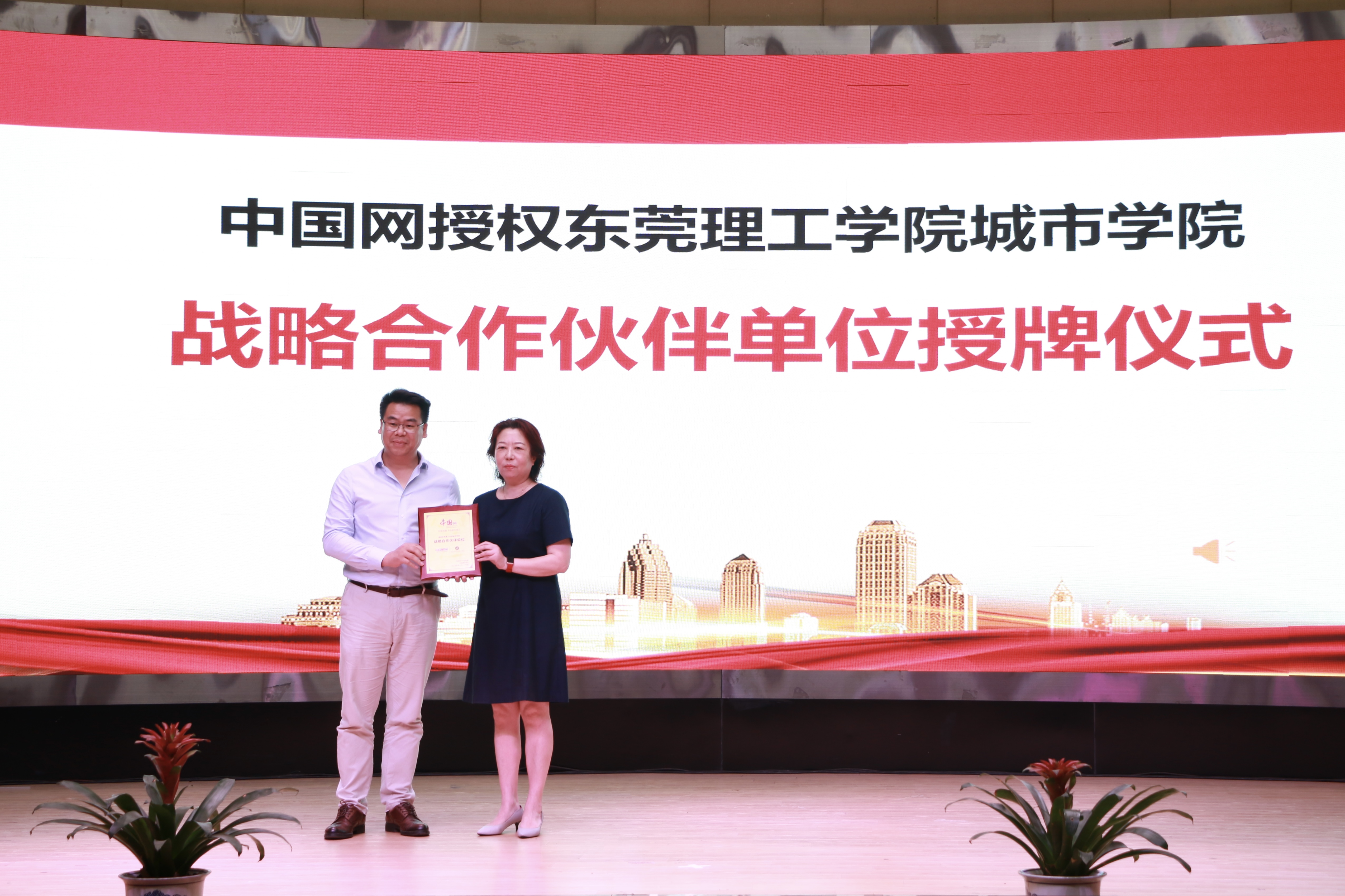 会上副校长刘玉侠和中国网品牌东莞总编辑刘献兵举行中国网授权东莞理工学院城市学院战略合作伙伴单位授牌仪式。