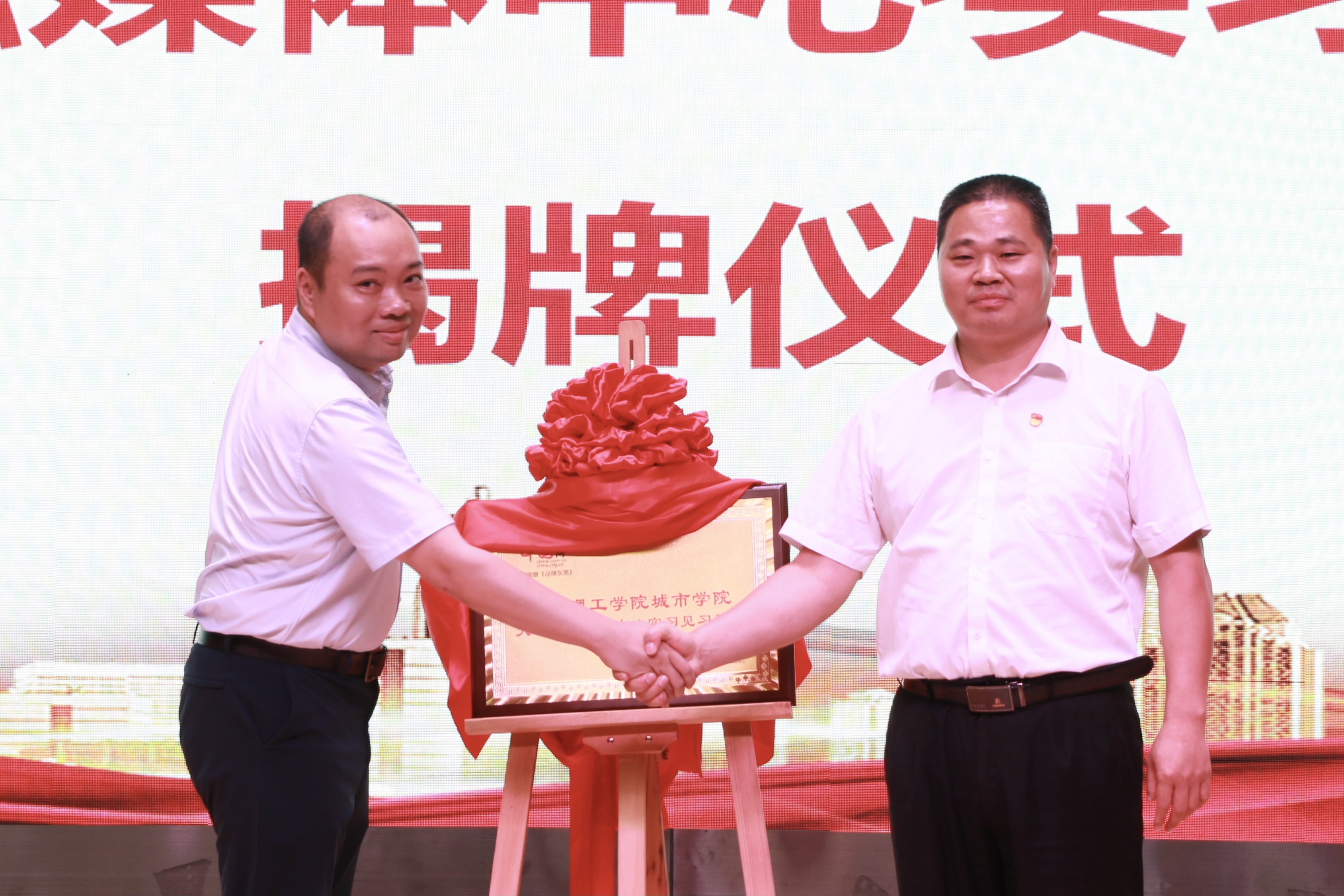 宣传部部长孔增强与东莞网品牌东莞副总编辑赵洋共同为“中国网东莞理工学院城市学院大学生融媒体中心实习见习基地”揭牌。