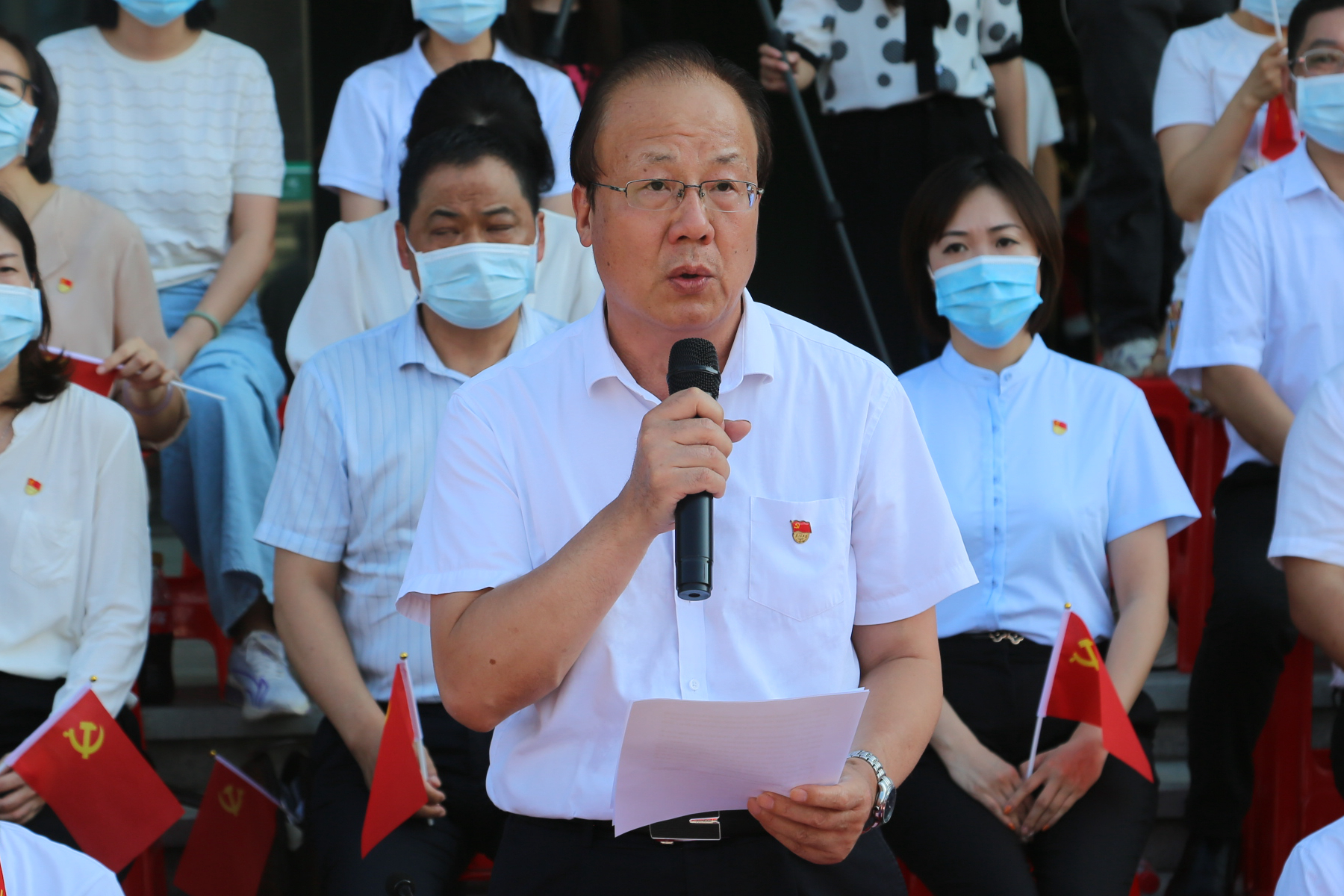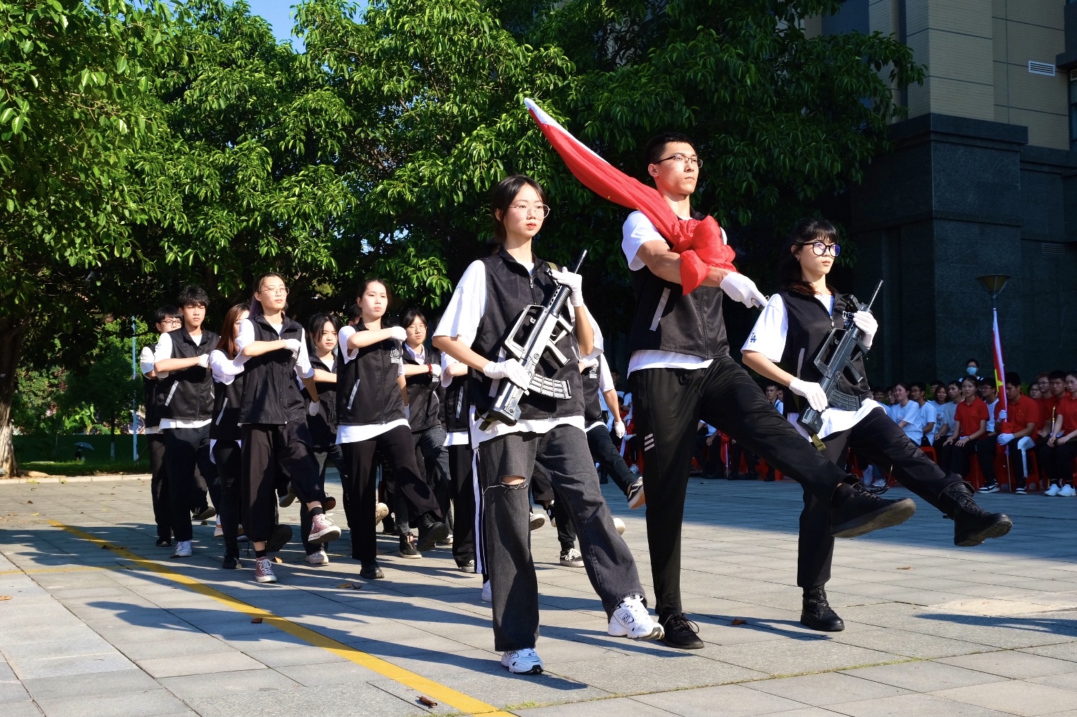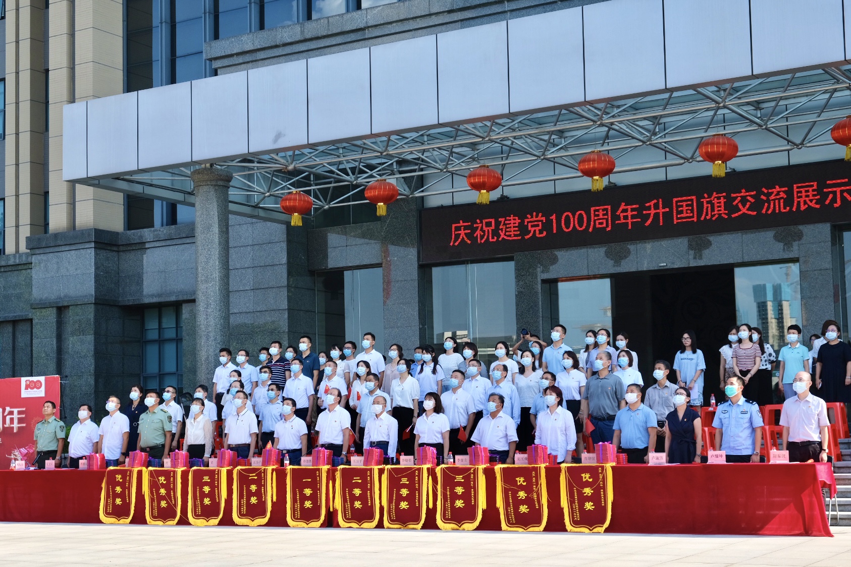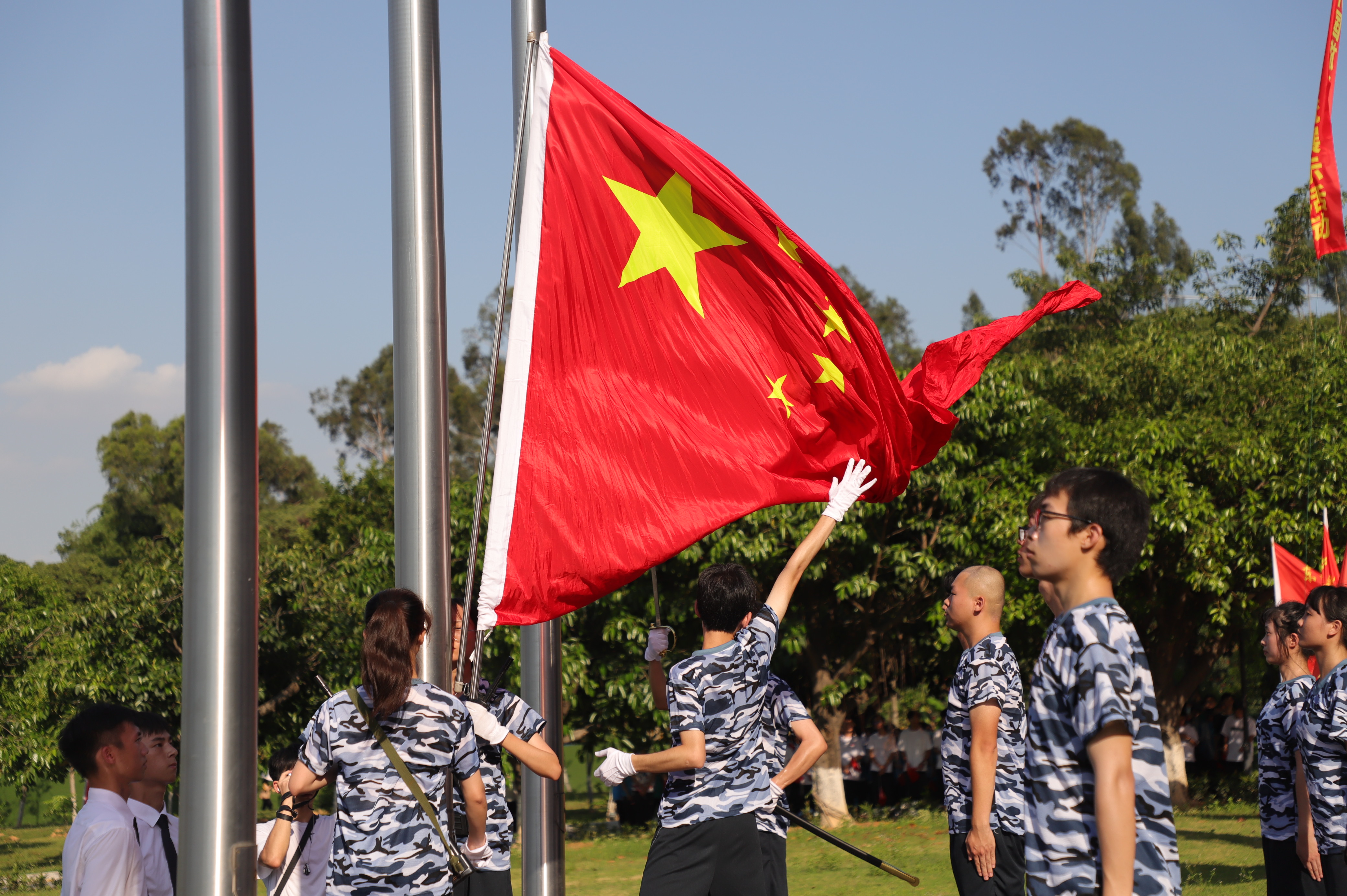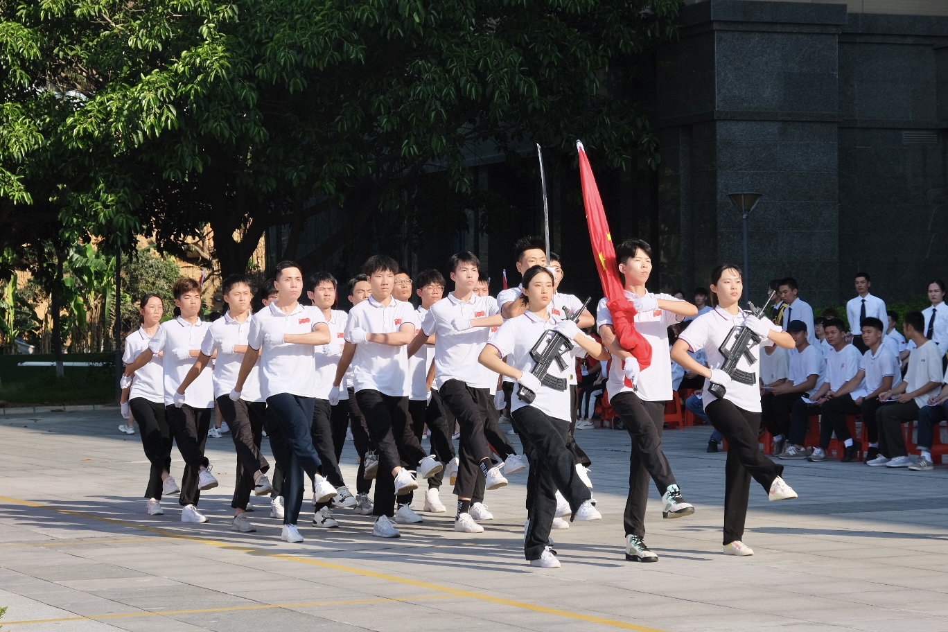 6月3日下午,学校在行政楼前举行庆祝建党100周年“升国旗交流展示暨同唱一首歌”活动。寮步镇退役军人服务中心副主任李敏怡、鸿发教育集团副总经理李奎山、寮步退役军人服务中心文拥军、泉塘派出所警长卢耀坤、寮步镇人民武装部干事尹锐新。学校党委书记章德胜,党委副书记、校长王卫平,党委副书记、副校长高香林、黄兢,副校长周庆、刘玉侠,各相关单位负责人、各党总支(直属支部)书记、副书记全校师生近四百人参加。武装部副部长刘维仝主持会议。