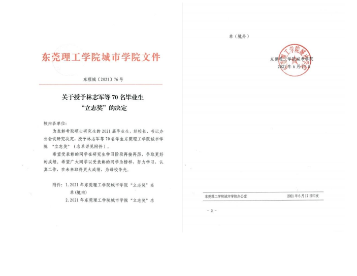 为表彰先进,树立榜样,学校决定授予林志军等70名毕业生“立志奖”。