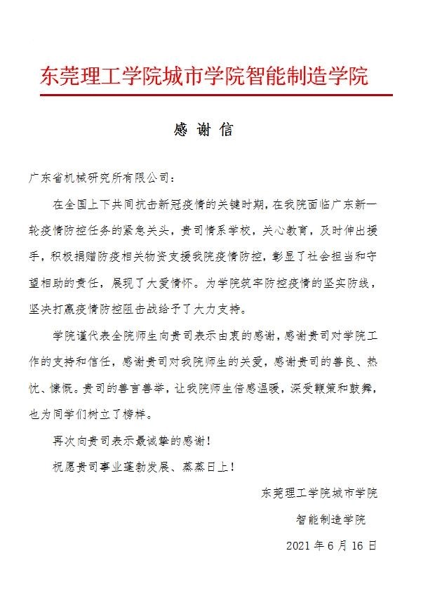 对此,米兰milan智能制造学院各级领导对广东省机械研究所有限公司表示由衷的感谢,并向该公司发去感谢函,在防疫面前,校企联动,共渡难关。希望我们以积极的态度,共同筑牢坚实防线,坚决打赢疫情防控阻击战。