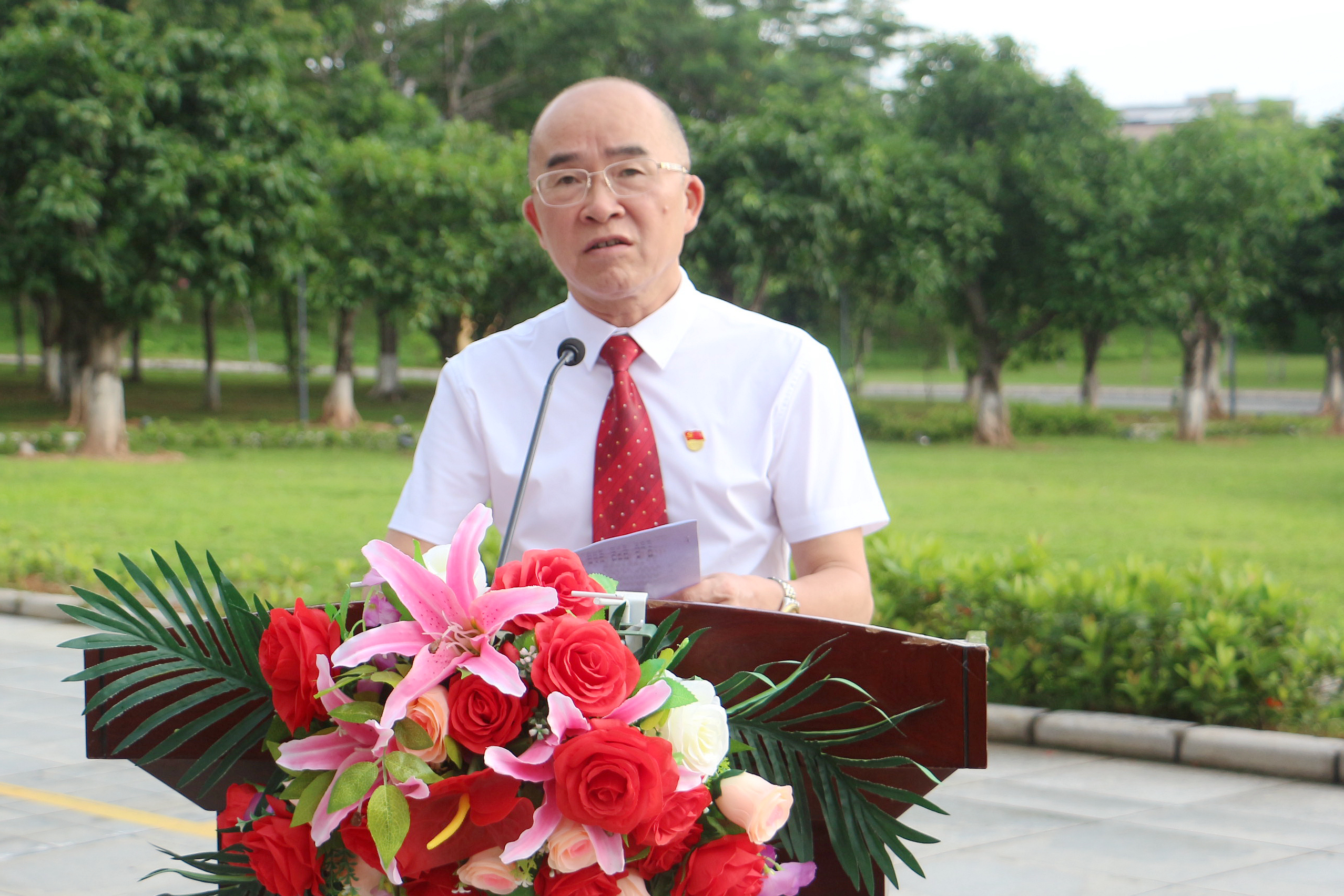 上午7时,在铿锵有力、整齐划一的脚步声中,国旗仪仗队来到升旗台前护卫国旗。在雄壮的义勇军进行曲中,五星红旗冉冉升起。在场领导、师生党员代表庄严站立,面向五星红旗高唱国歌,激情澎湃。