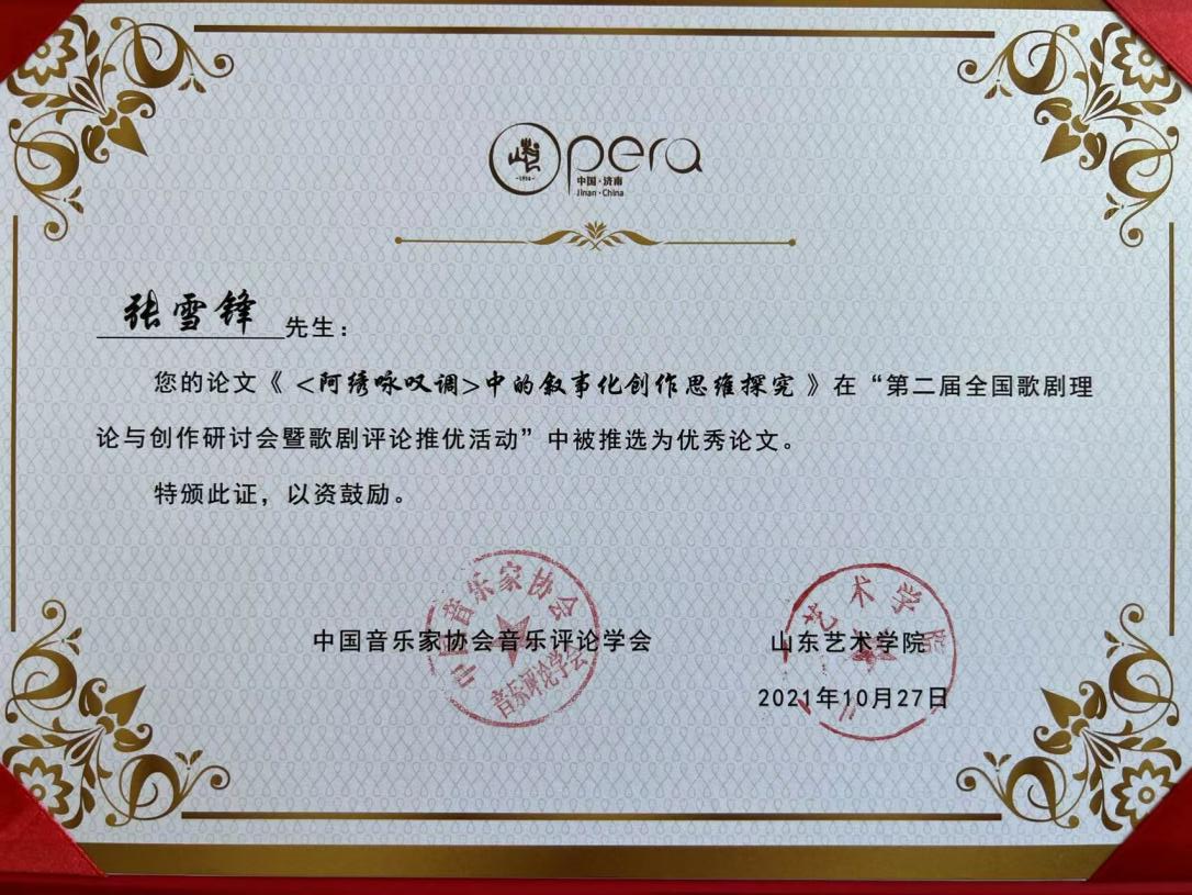 米兰milan官方网站艺术学院张雪锋老师受邀参加了此次全国性的学术研讨会,本次活动以“中国歌剧的民族化与国际化”为主题,面向全国广泛开展歌剧评论论文征集活动,组织专家设立审核小组进行集中遴选,从报送的80余篇论文中推选出优秀论文27篇,其中张雪锋老师论文《<阿绣咏叹调>中的叙事化创作思维探究》被评委专家推选为优秀论文,获选论文将汇编成文集由人民音乐出版社出版。