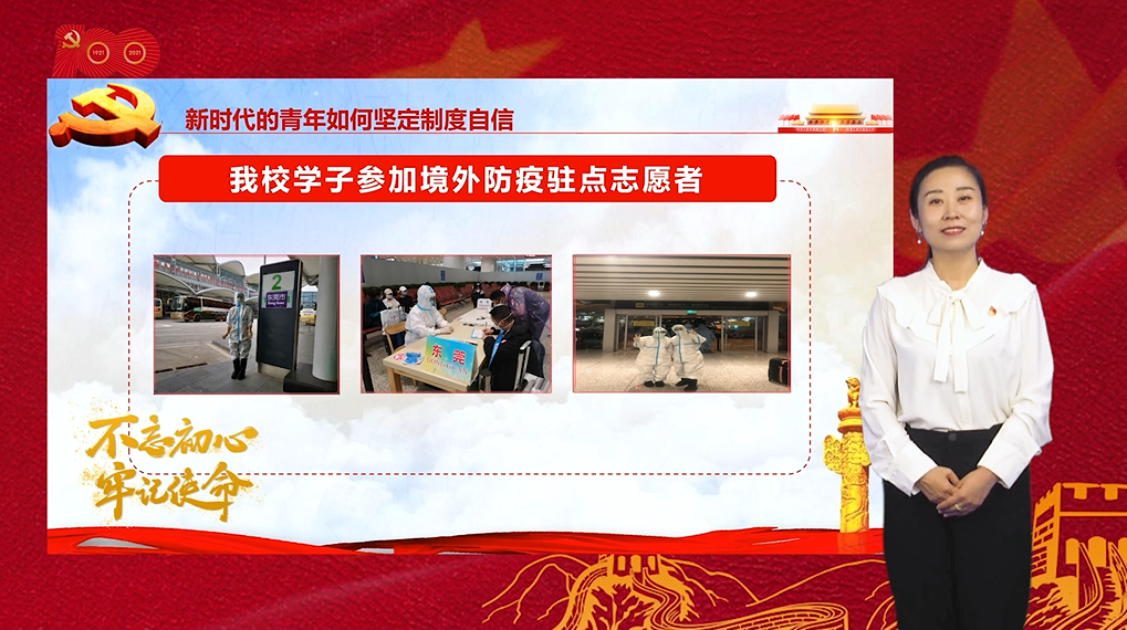 段妍君老师主讲的《彰显制度优势,坚定制度自信》微党课以新冠肺炎疫情为主线,分别从什么是中国特色社会主义制度,如何彰显中国特色社会主义制度的优势,新时代的青年如何坚定制度自信三个方面进行讲解。课程运用了讲授、试听组合、实践练习等形式,旨在激发学生的兴趣与积极性,并穿插课堂互动促使学生主动思考,从而坚定学生理想信念,牢固树立马克思主义的世界观、人生观、价值观,努力培养担当民族复兴大任的时代新人。