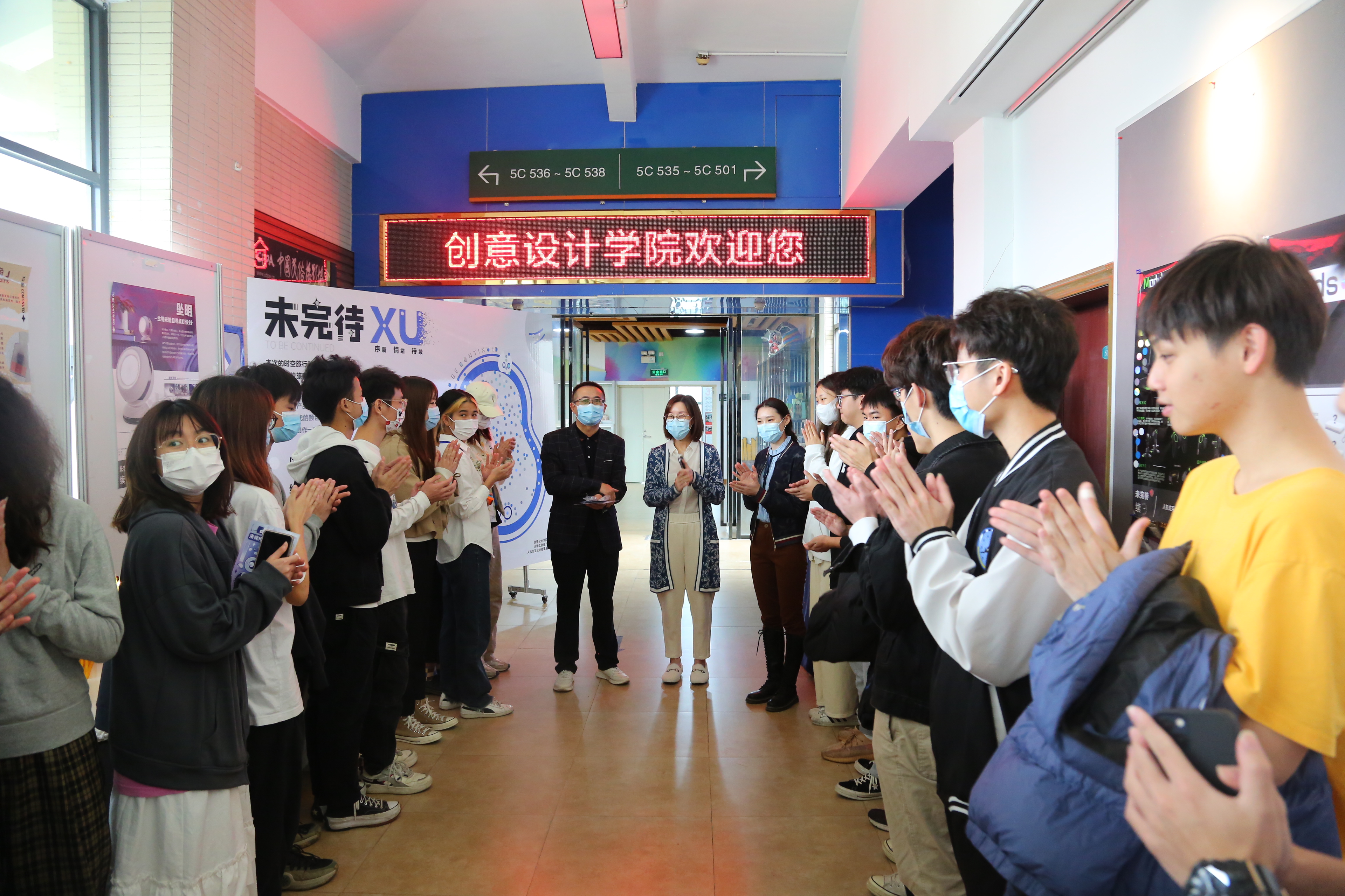 随后,领导一行在王锦锋院长的带领下来到5号教学楼F5连廊参观2019级人机交互设计专题结课展。结课展以“未完待XU”为主题,包括“序——序篇”、“绪——情绪”“续——待续”三个交互板块,分别对应传统、现代、未来三个子课题,让参观者体验一次交互上的时空旅行。本次展览共展出工业设计刘蔚、肖旸宇、何靖怡、袁艺等老师指导的工业设计专业学生40件作品,包括“弈品好茶”茶具设计、“象六”加湿器、美妆套装设计、助眠VR眼镜、口罩包装机、“急救X”模块化应急救援产品等,涵盖各类生活场景中人机交互设计的应用,并且让参观者可以现场体验产品互动的乐趣。