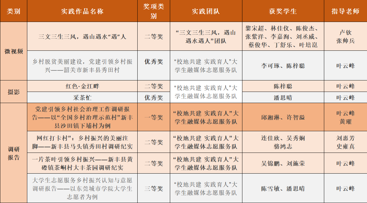 由融媒体中心叶云峰、黄璀老师指导的“校地共建 实践育人”大学生融媒体志愿服务队邱湘淋、许智溢撰写的《党建引领乡村社会治理工作调研报告——以“全国乡村治理示范村”新丰县沙田镇下埔村为例》荣获一等奖。