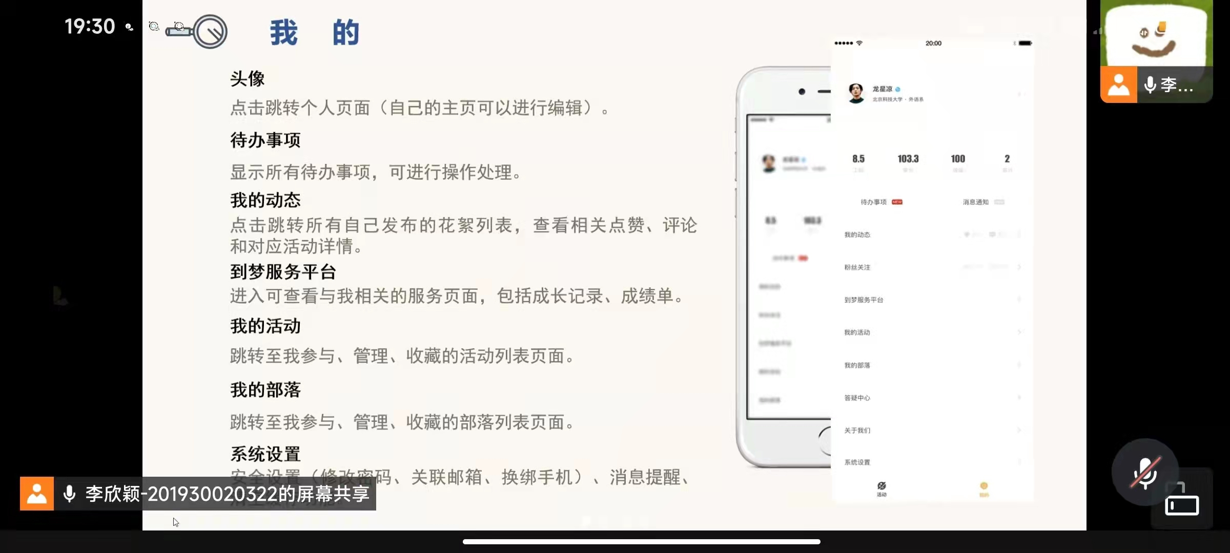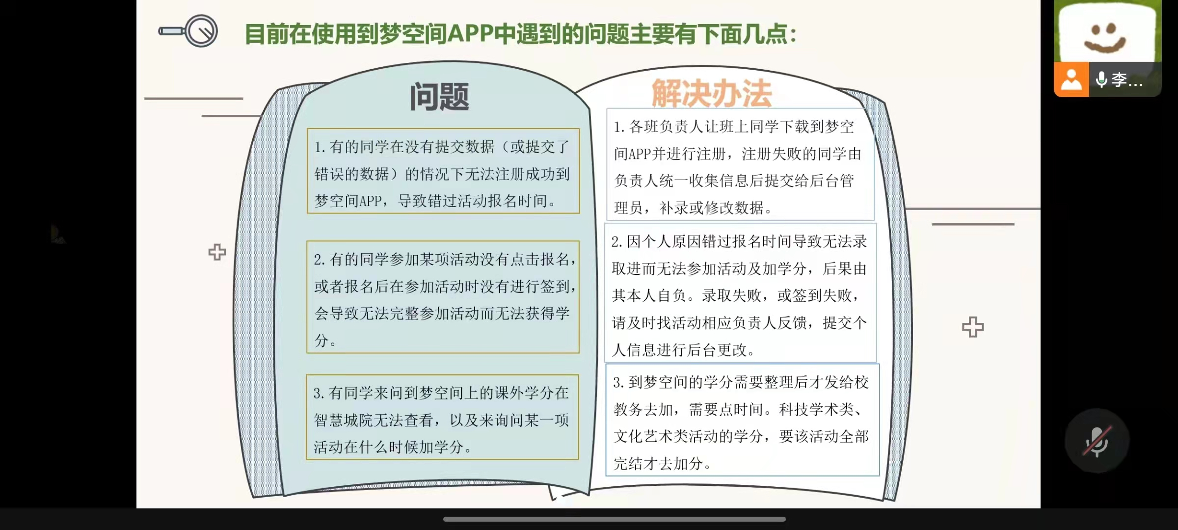 宣讲会围绕到梦空间的软件介绍、活动页面以及主页“我的”三个方面展开。李同学通过流程图的形式,对到梦空间参加活动并获得课外学分的过程步骤做了详细讲解。到梦空间活动页面有活动推荐、热门部落、专题活动以及全国活动四个栏目,同学们可根据自己的实际情况与兴趣爱好筛选出合适的活动参与。无论是活动、部落还是专题,到梦空间都提供了详细解析,同学们可以在活动页面了解详情。在“我的”页面中,李同学分别将栏目用处做讲解,并针对“待办事项”这一较为重要的栏目做更加细致地介绍。李同学还将第二课堂成绩单分为学分版和记录版两大类,以红色字体在PPT中标示出两者的区别,以免同学们混淆。最后,李同学针对到梦空间目前使用问题做出了详细的解决方案。