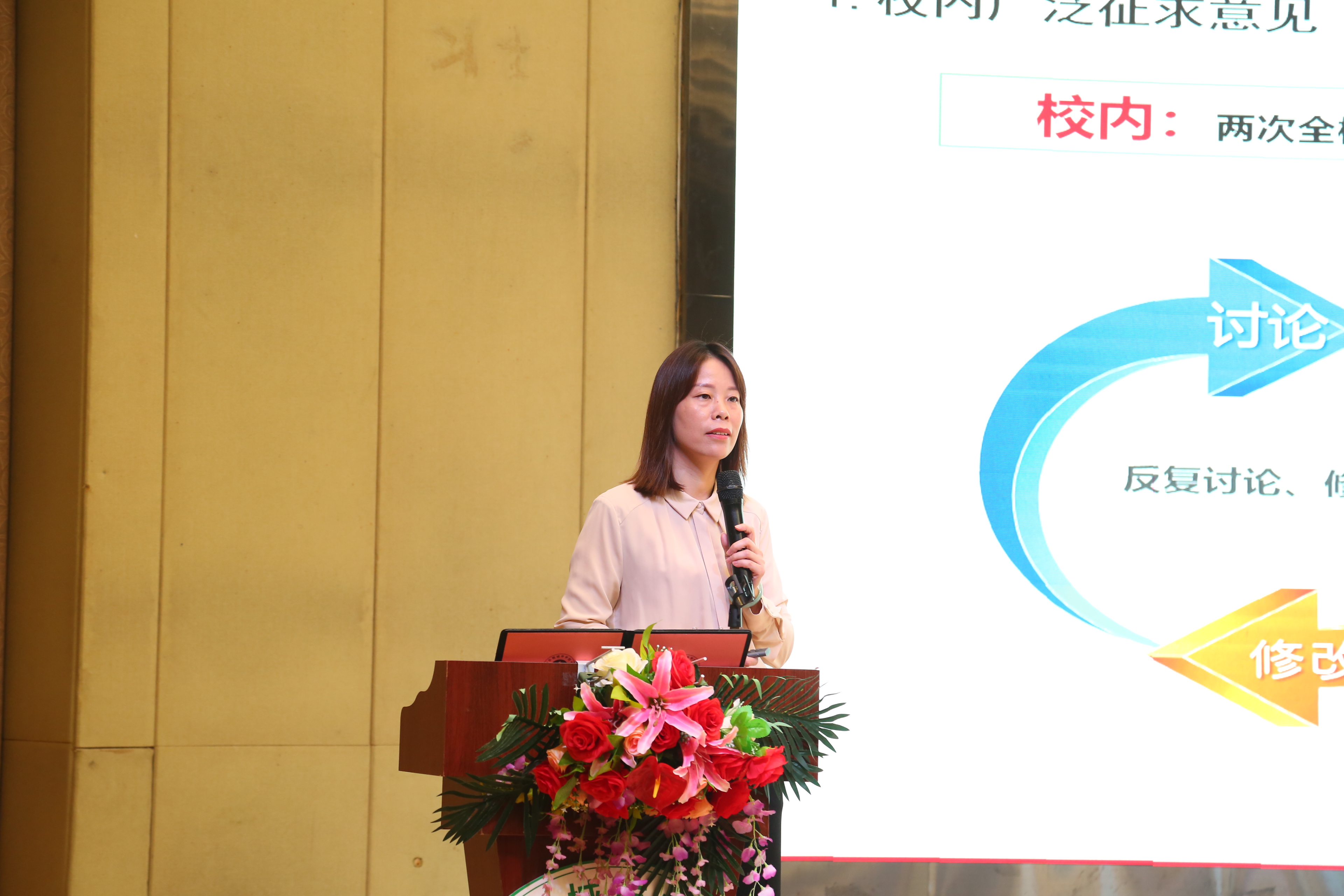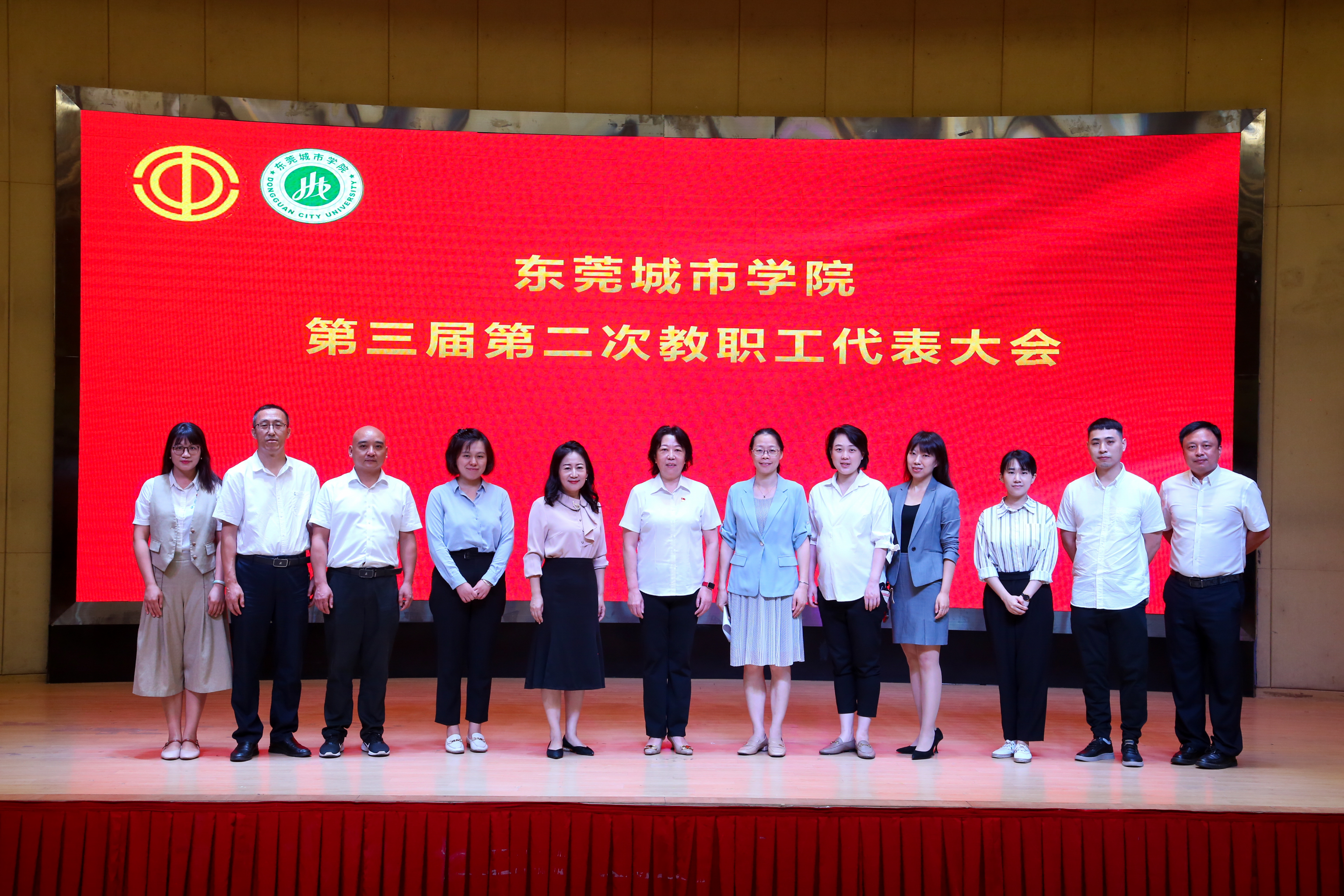 在雄壮激扬的国歌声中,大会拉开帷幕。执行校长李树英作《同心同德,干事创业,奋力推进学校高质量发展》的工作报告。报告全面回顾了学校2021-2022学年度工作情况。过去的一学年,学校完善发展顶层设计与管理领导体制设计,科学制定学校“十四五”发展规划,高标准高质量推动党史学习教育,进一步优化基层党组织设置,党建工作水平再获提升。学校坚持依法治校,全力做好新冠疫情防控工作,有效保障校园稳定。学校奋力推行人事制度改革,激发体制机制活力,不断优化师资队伍结构,提升人才队伍素质。学校招生规模创历史新高,构建了完备的三全育人体系,继续深入人才培养模式改革,进一步加强专业建设和课程建设。科研业绩大幅提升,学校启动硕士研究生联合培养,成功获批广东省博士工作站。学校不断加强国际交流与合作,构建全员参与、全领域覆盖的立体式新媒体平台,品牌建设水平不断提升。学校进一步完善校园硬件建设,新一代校园网建设完成更新,馆藏资源不断丰富,为师生提供更良好的学习生活环境。同时,李树英也指出了学校还存在一些不足之处。