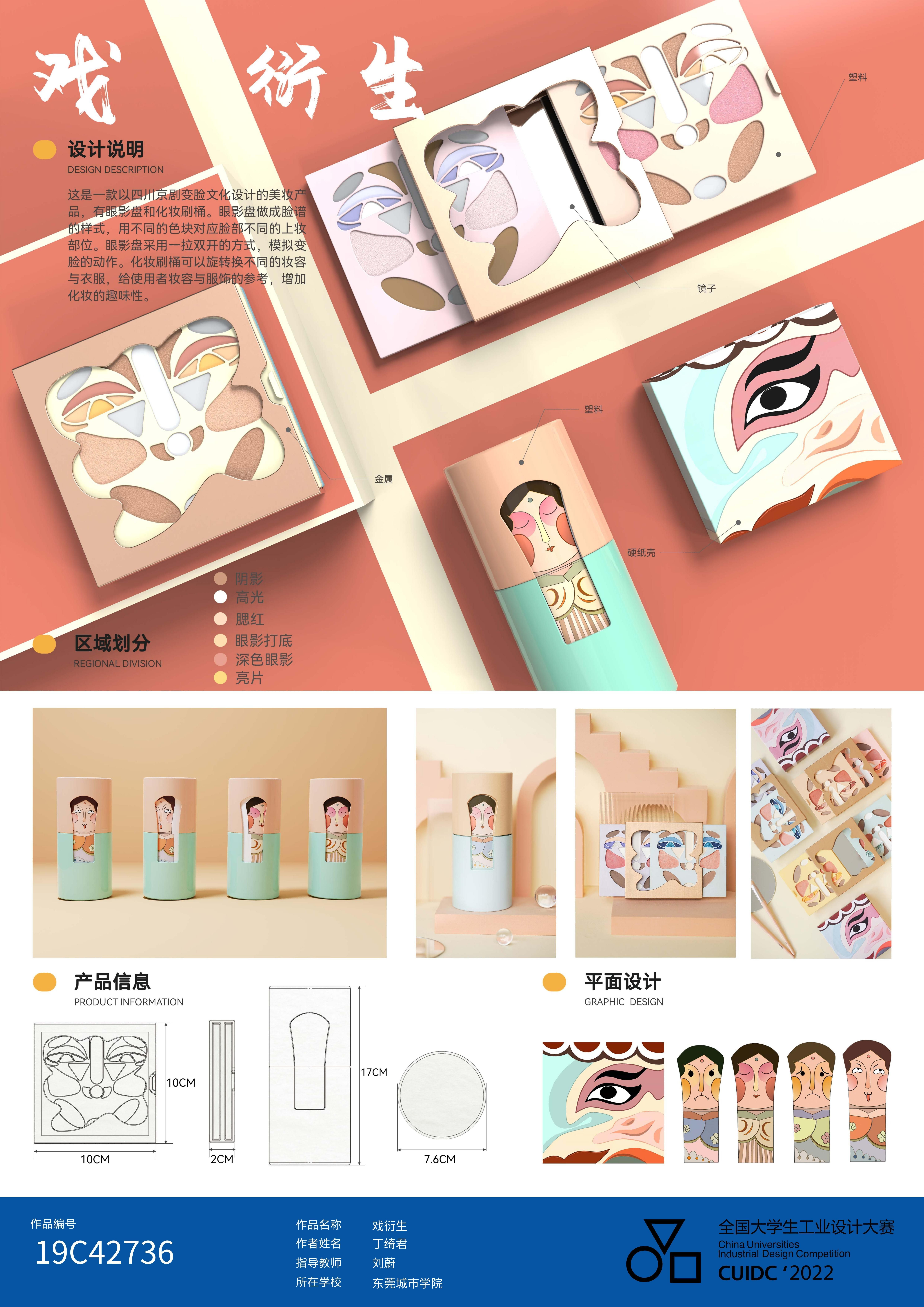 这是一款以四川京剧变脸文化设计的美妆产品,有眼影盘和化妆刷桶。眼影盘做成脸谱的样式,用不同的色块对应脸部不同的上妆部位。眼影盘采用一拉双开的方式,模拟变脸的动作。化妆刷桶可以旋转换不同的妆容与衣服,给使用者妆容与服饰的参考,增加化妆的趣味性。