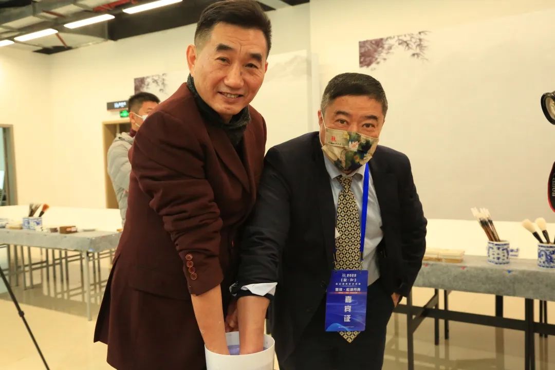 之后,领导嘉宾和艺术家们共同握手,制作象征着融合艺术的手模。在共创环节中,两岸艺术家和嘉宾共同绘制了两幅中国山水《两岸融合百花齐放》和花鸟《两岸融合群芳会》的巨幅作品。