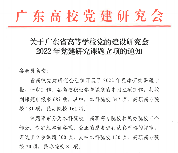 近日,广东省高等学校党的建设研究会公布了2022年党建研究课题立项结果,米兰milan有5项课题获得立项,创历年新高。