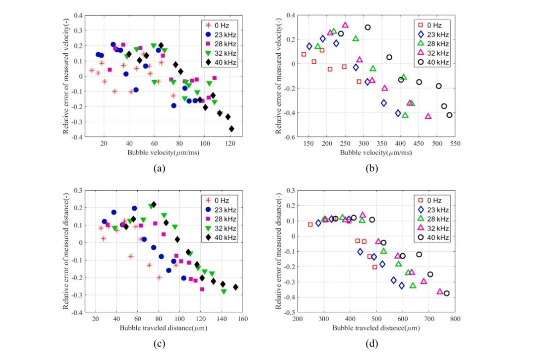 为此,肖健博士带领研究团队利高速相机对微细通道流动沸腾气泡运动特性进行研究,利用图像处理技术建立气泡追踪算法、气泡运动速度计算算法,研究气泡的生长、轨迹、速度和移动距离,定性和定量地描述微细通道中沸腾流的气泡运动行为。 研究发现,超声作用后气泡的脱离频率、速度和移动距离显著增大,生长行为和生长轨迹极其复杂,气液两相流动极不稳定。随着超声频率的增加,气泡获得动能,并且利用数值仿真技术定性研究超声场作用下微通道内气泡运动的机理。