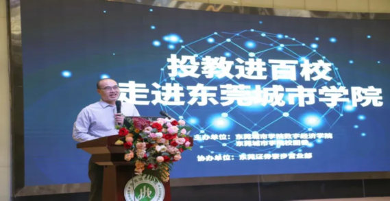 东莞证券寮步营业部副总经理陈杰意以金融行业前景规划为主题进行分享,从东莞证券的基本情况、招聘岗位、职业前景、行业对比、培养方案五个方面作详细讲解,并积极与学生互动,现场氛围热烈。