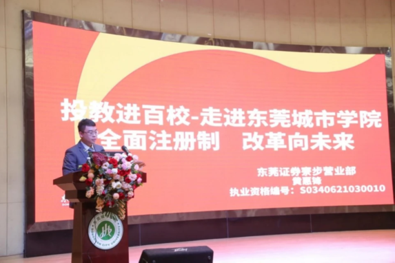 东莞证券寮步营业部投资顾问黄惠锋给学生讲解全面注册制内容,让学生了解全面注册制的重要性以及对今后金融市场的深刻影响。