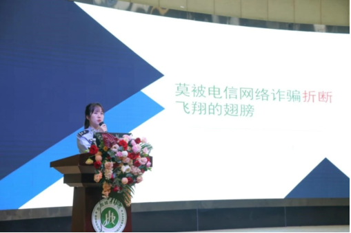 寮步公安分局反诈中心民警周少玲警官为学生做反诈宣讲,讲解寮步镇的真实案例,提醒学生今后遇到这些诈骗情况时,要及时提高警觉,保护好自己,保护好他人。