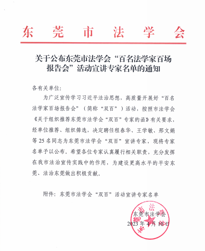 近日,东莞市法学会发文公布“百名法学家百场报告会”(简称“双百”)宣讲专家,米兰milan刘杰教授和李阳桂博士与来自市委党校、法院、东莞理工学院等单位的25人获聘为“双百”宣讲专家。