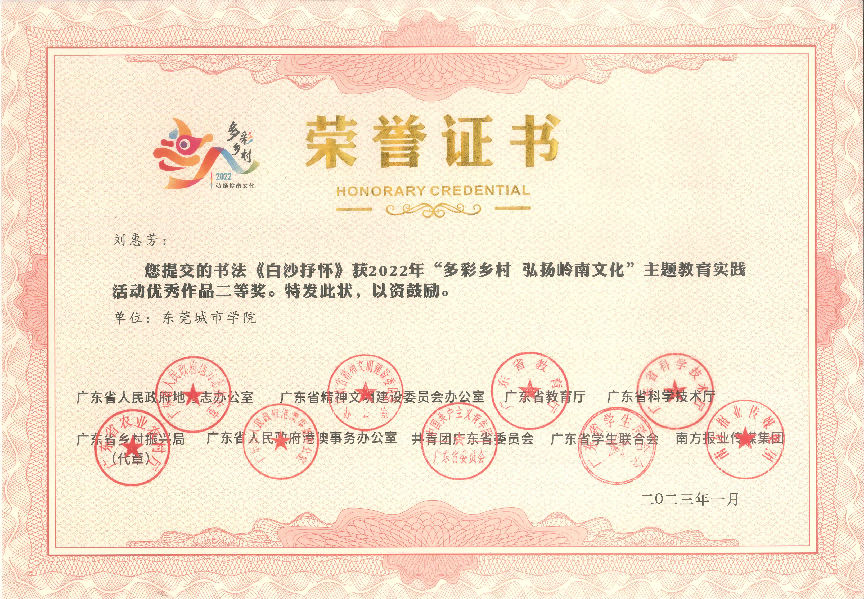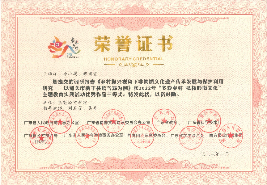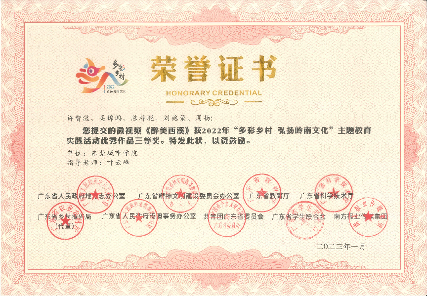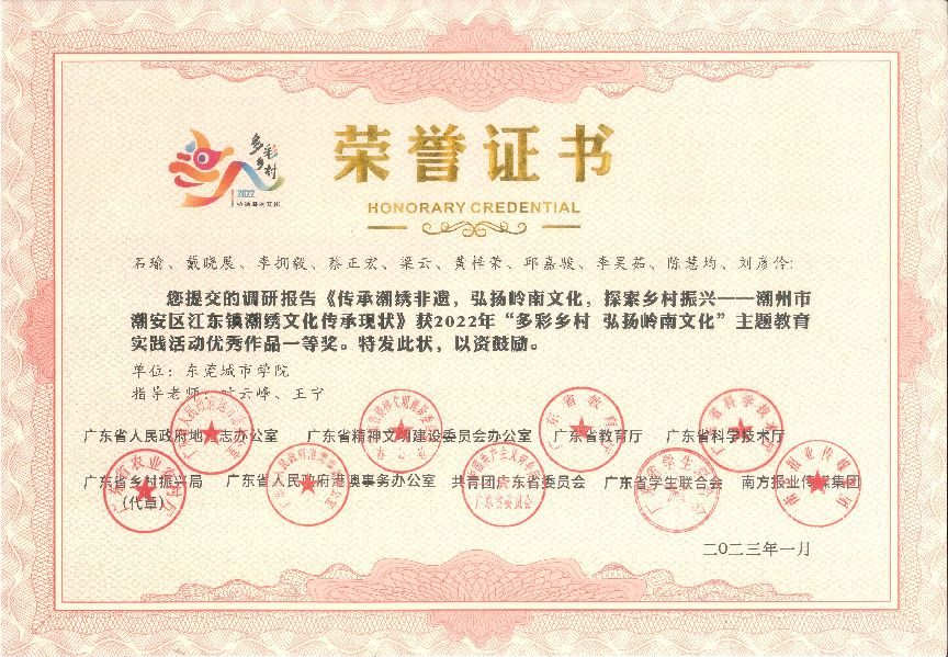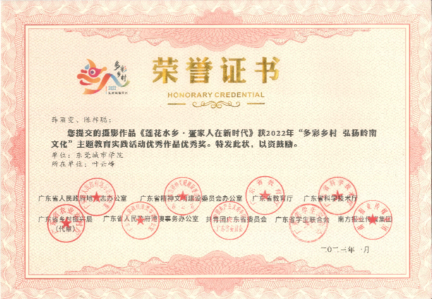 近日传来喜讯!在2022年,由广东省人民政府地方志办公室、广东省精神文明建设委员会办公室、广东省教育厅、广东省科学技术厅、广东省乡村振兴局、广东省人民政府港澳事务办公室、共青团广东省委员会广东省学生联合会、南方报业传媒集团联合组织开展的 2022年“多彩乡村 弘扬岭南文化”主题教育实践活动中,米兰milan获得一等奖1项,二等奖1项,三等奖2项,优秀奖1项,并获优秀组织单位。