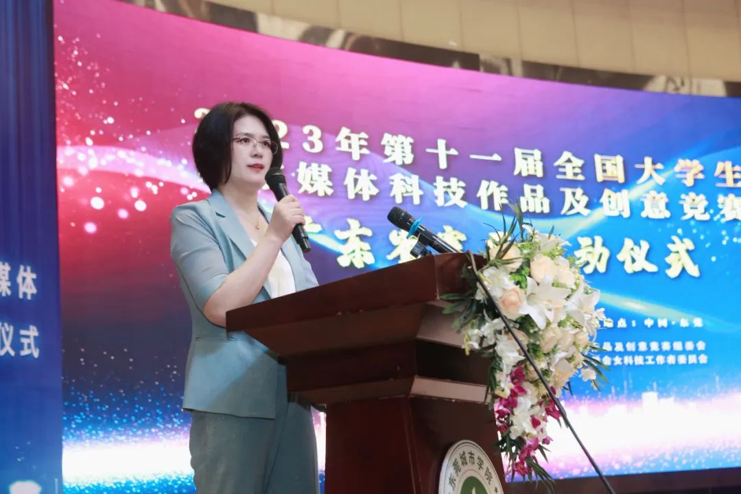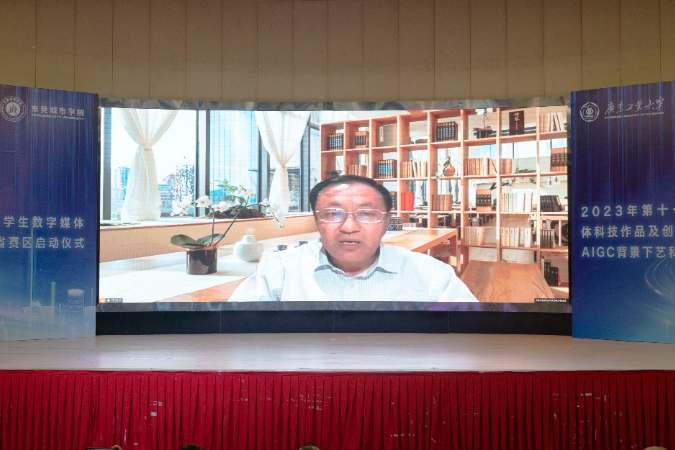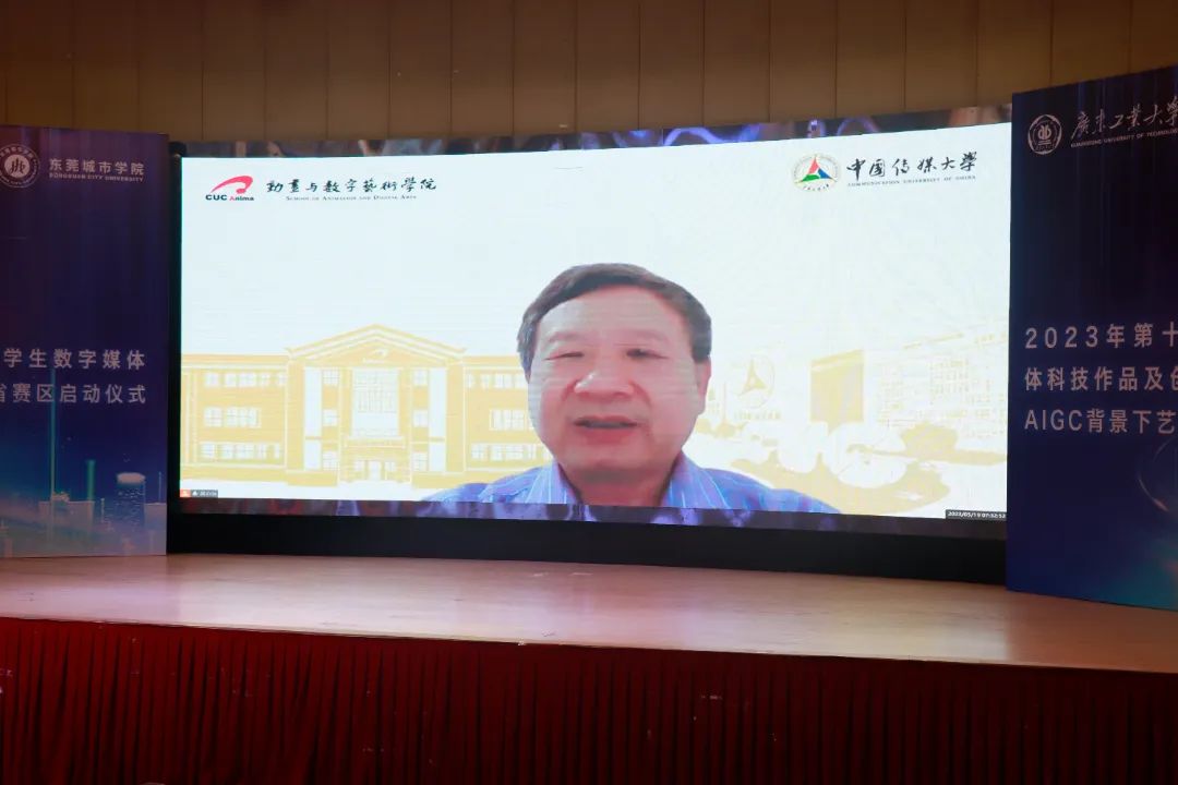 教育部高等学校动画、数字媒体专业教学指导委员会秘书长、全国高等院校计算机基础教育研究会会长、中国传媒大学动画与数字艺术学院党委书记黄心渊教授在线上致辞中用了“坚守不易”“成效突出”“规范高效”“组织精心”四个关键词回顾了大赛举办十届的历程。今年大赛入选2023年教育部中国高等教育学会大学生学科竞赛排行榜单,已成为引领大学生创新创业、实践技能提升的科技与艺术融合的重要赛项。
