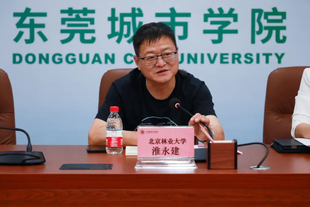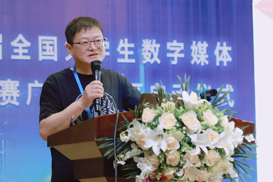 教育部高等学校动画、数字媒体专业教学指导委员会委员、北京林业大学信息学院淮永建教授致辞。他分享了和其他学校的教学交流,提出了关于艺术学院发展的相关建议。他认为高校与企业合作能够获得更多的支持和资源,可以促进学校在比赛中获得更好的成绩。同时,也可帮助比赛走向国际化。