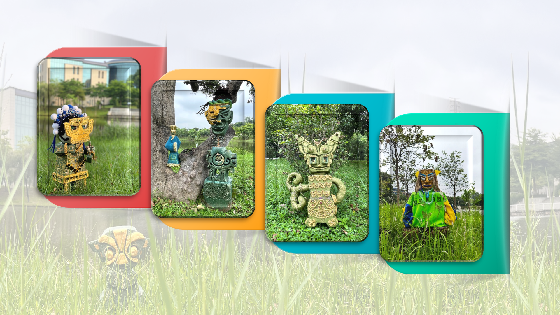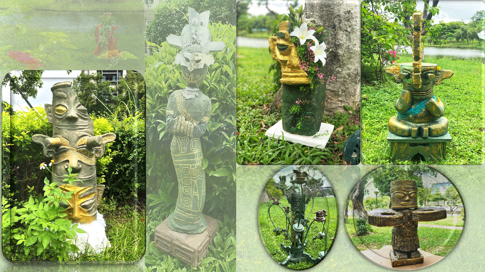 此展作品以三星堆为题,共计62件作品,学生们天马行空的异想世界,营造富有古金的校园场域,通过再现古蜀文明的创意造型表现与当代艺术共存交融,在显与隐,新与旧之间,找到设计的平衡点,穿越古今,凝望未来,创造公共空间营建与古文物对话的新体验,在校园中留下美的刻度与烙印。