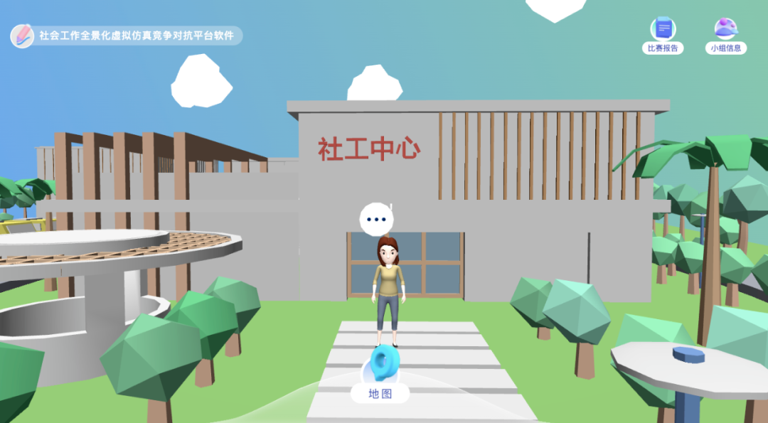 此次比赛采用线上仿真模拟对抗方式进行,全省社工专业学生在同一实务平台比赛角逐。比赛选手在3D全景立体真实社区平台,以分组模拟社工机构进行投标和运营的形式展开,选手先后完成“社工机构实务能力检验”“医务领域招投标模拟对抗”“青少年领域招投标模拟对抗”“司法领域招投标模拟对抗”等四个仿真实务场景。