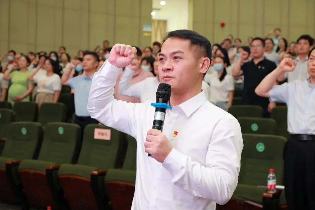 “我志愿加入中国共产党,拥护党的纲领,遵守党的章程……”紧接着学校新党员代表进行了入党宣誓,全体老党员在党委委员李海冬同志带领下再次重温入党誓词。