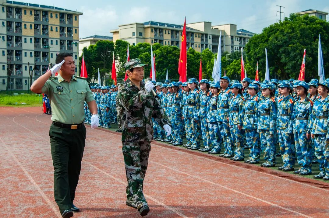 学校校长陈明在军训团团长刘维仝的陪同下对学生方队进行检阅,参训的学生激情昂扬,以饱满的精神接受检阅。